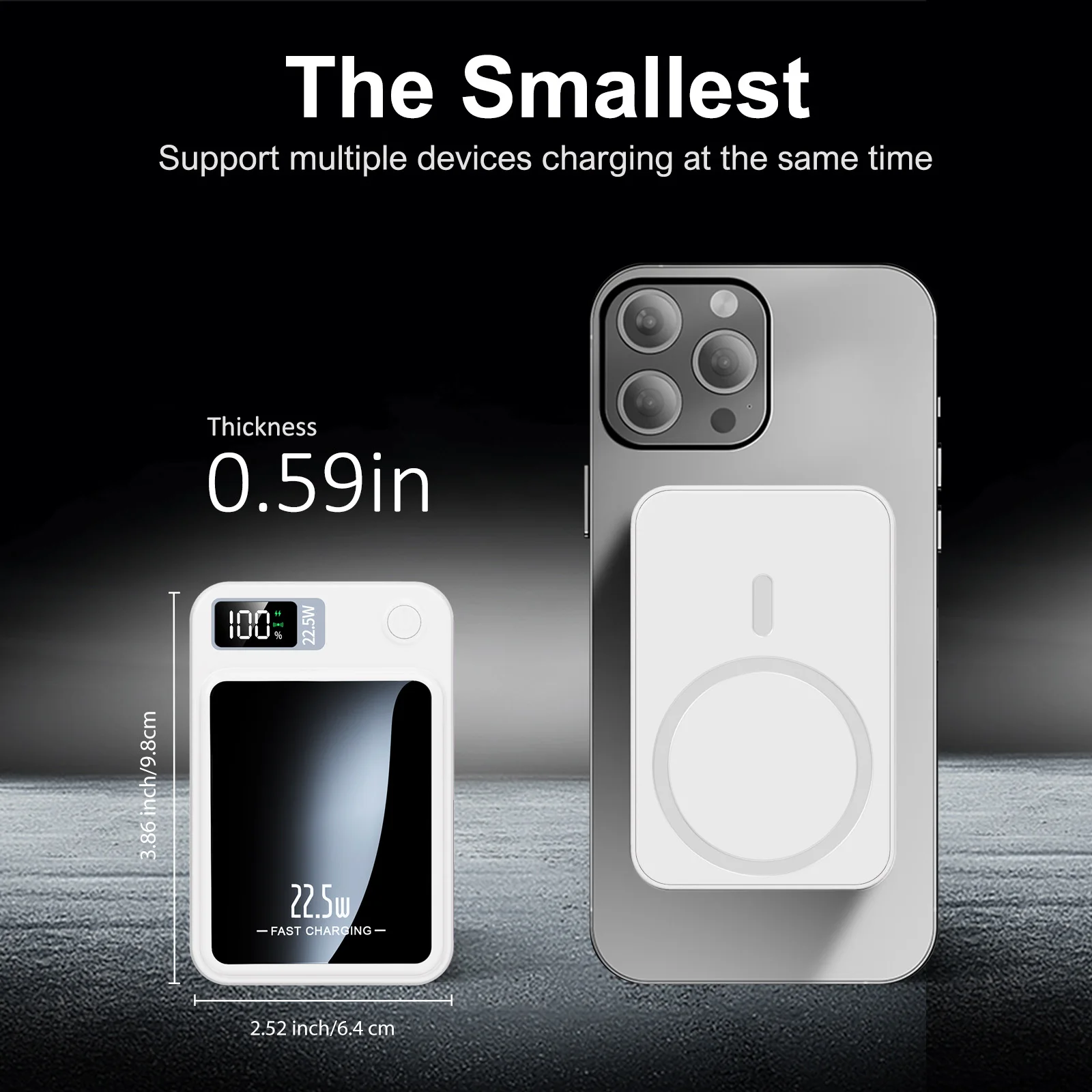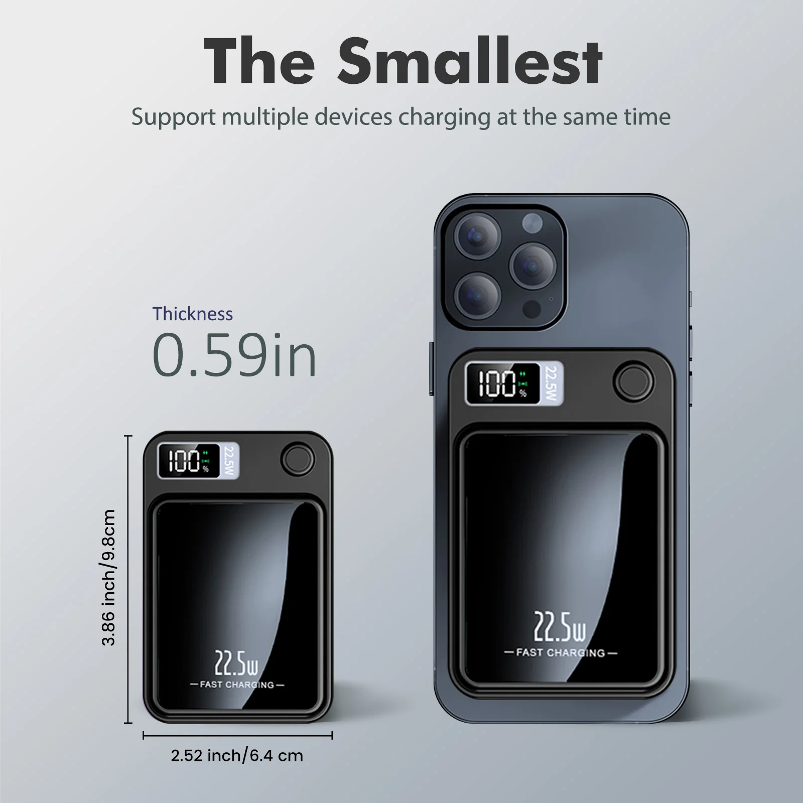 Its strong magnetic design allows it to attach securely to compatible magnetic phones and magnetic phone cases for a more stable wireless charging experience. The slim profile measures about 0.59 inches thick and fits easily into a pocket, bag, or travel pouch without adding much bulk. A clear LED display lets you check remaining power at a glance, while fast charging support up to 22.5W helps reduce downtime when you need power quickly.