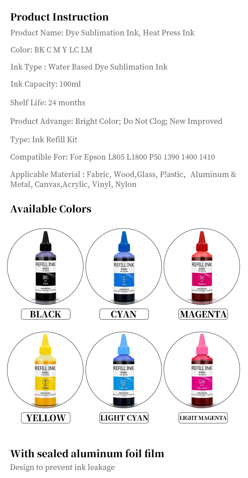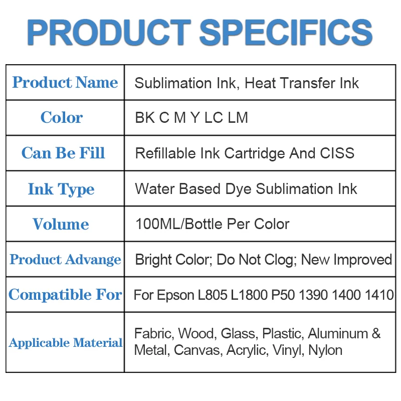 Transform your printing experience with our premium 100ML*6 Dye Sublimation Ink set, designed to deliver vibrant, long-lasting colors for all your creative projects. Specially crafted for Epson printers, including models like L805, L1800, P50, 1390, 1400, and 1410, this ink ensures flawless results with every use.