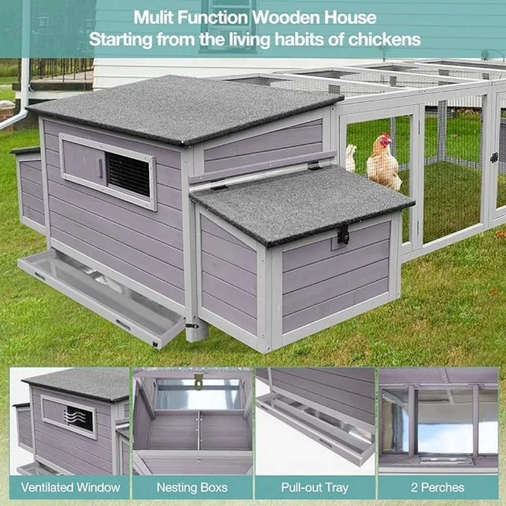 - Comfortable Living Space for Your Chicken: This chicken coop features 2 nesting boxes for laying or hatching eggs, a leak-proof pull-out tray for daily cleaning, 4 perches for resting, a non-slip ramp to the living area, and a spacious outdoor run for play and exercise.