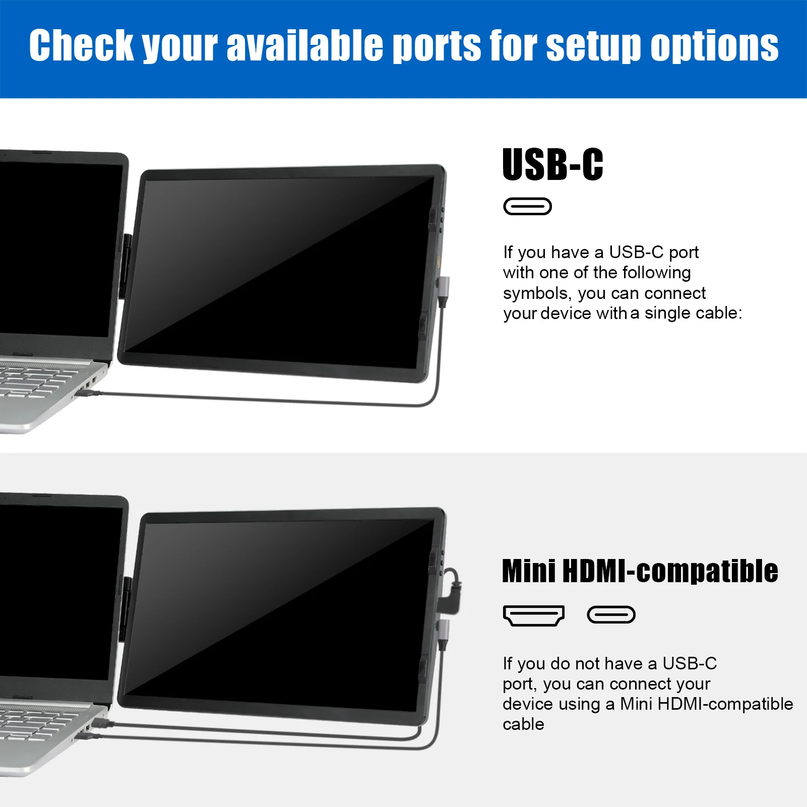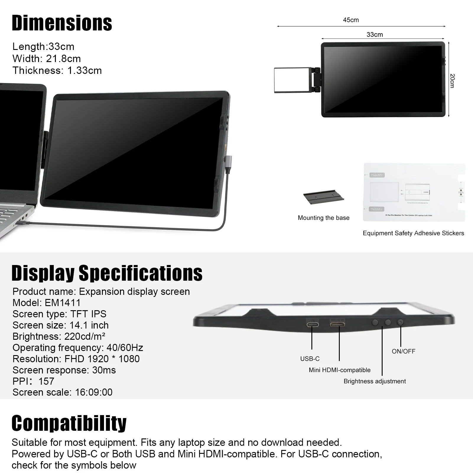 - The display can be connected to the laptop through a MINI HDMI-compatible cable to mirror or extend the screen. (The customer needs to manually set the display end)