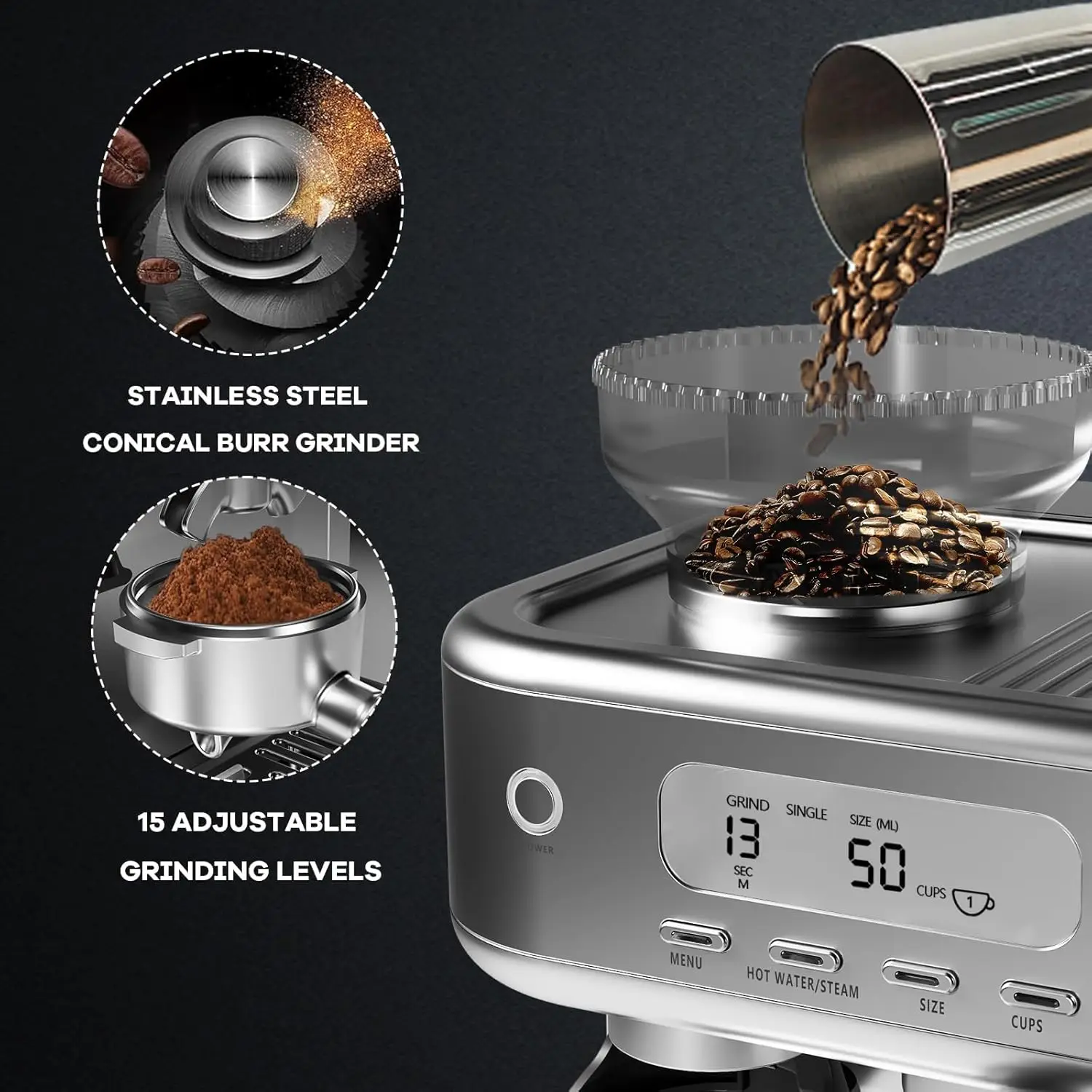 • Adjustable Conical Burr Grinder: Built-in, quiet grinder with 15 adjustable settings. Press a button to achieve your desired grind size and streamline the brewing process.