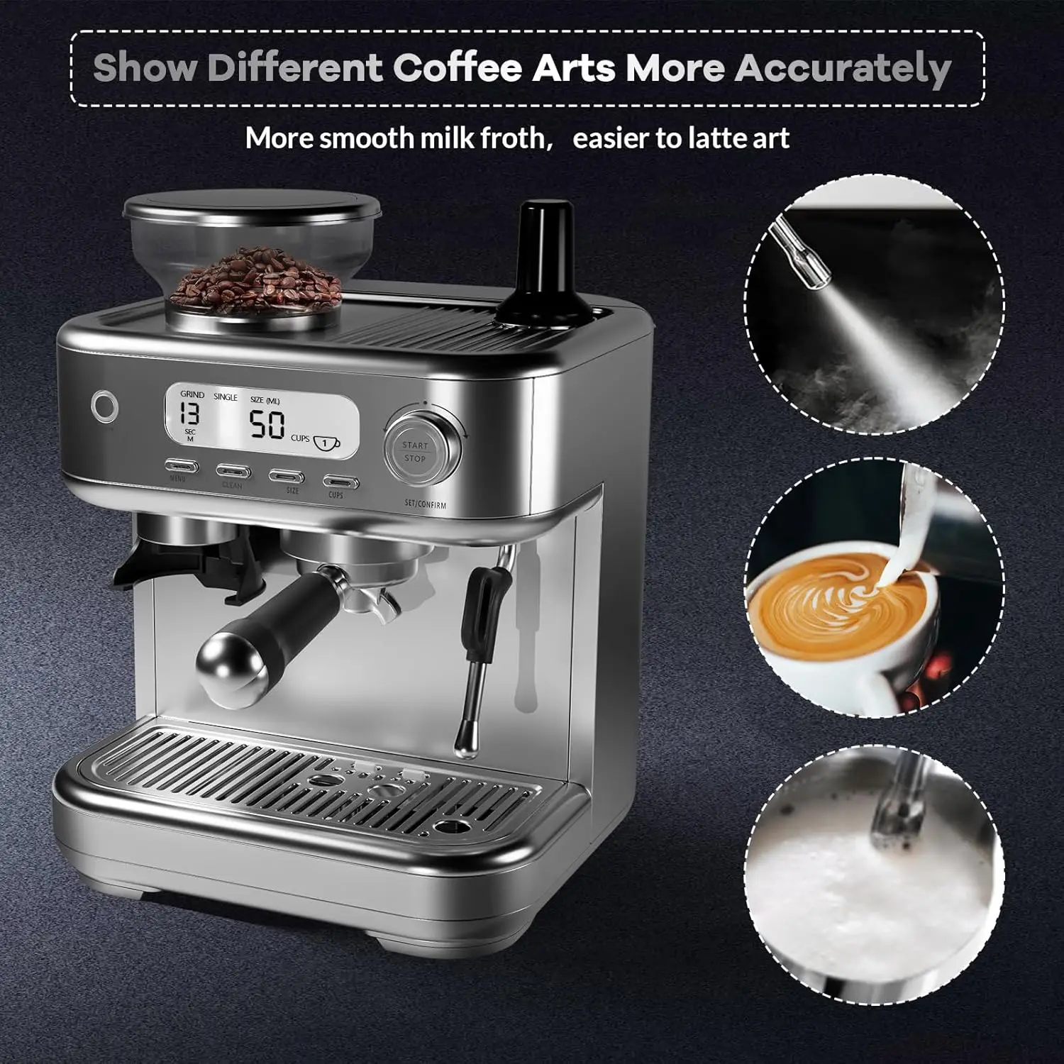 - Intuitive LCD Display: The LCD shows animations of grinding and extraction, giving clear, precise information to craft your coffee consistently. On-screen prompts guide proper operation for a perfect espresso-based drink every time.