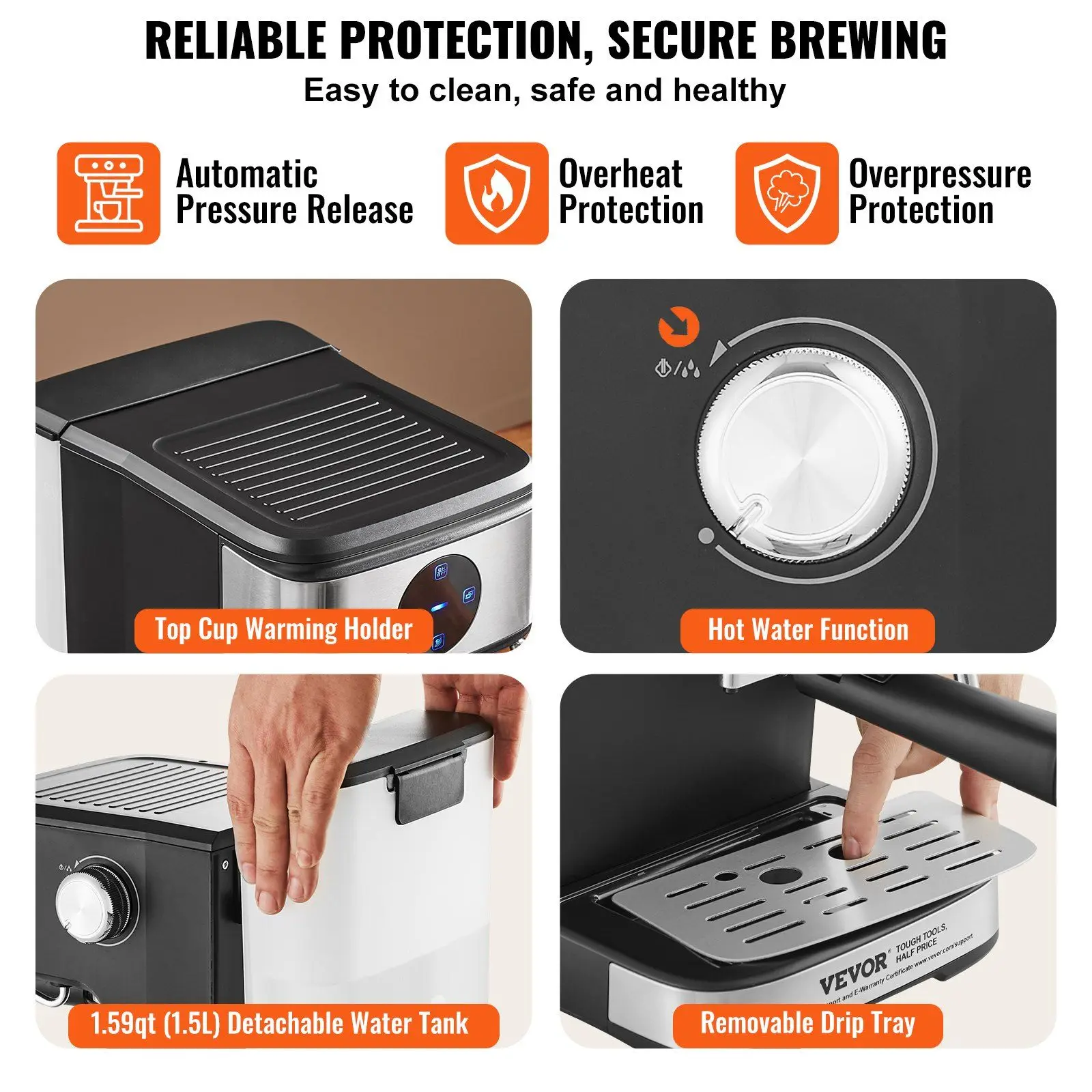 Experience coffee perfection with this VEVOR espresso machine. A professional 15-bar system with low-pressure pre-soak, rapid preheating, adjustable 1/2-cup volume, NTC temperature control, and a soft touch screen delivers consistent, café-quality results at home.