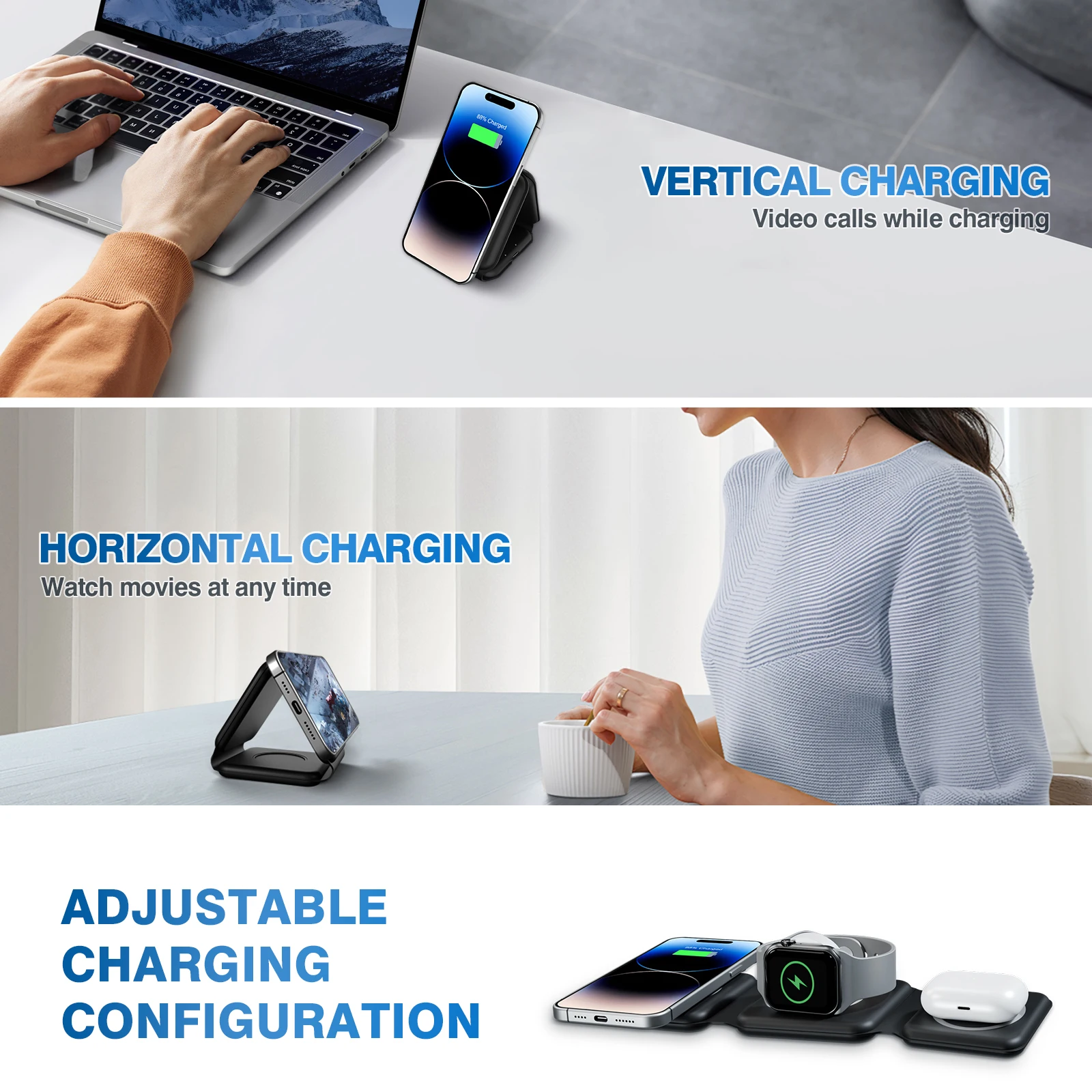 Keep your desk, nightstand, or travel bag organized with this foldable 3-in-1 wireless charging station designed to charge your everyday devices in one compact setup. Its space-saving design makes it easy to use at home, at work, or while traveling.