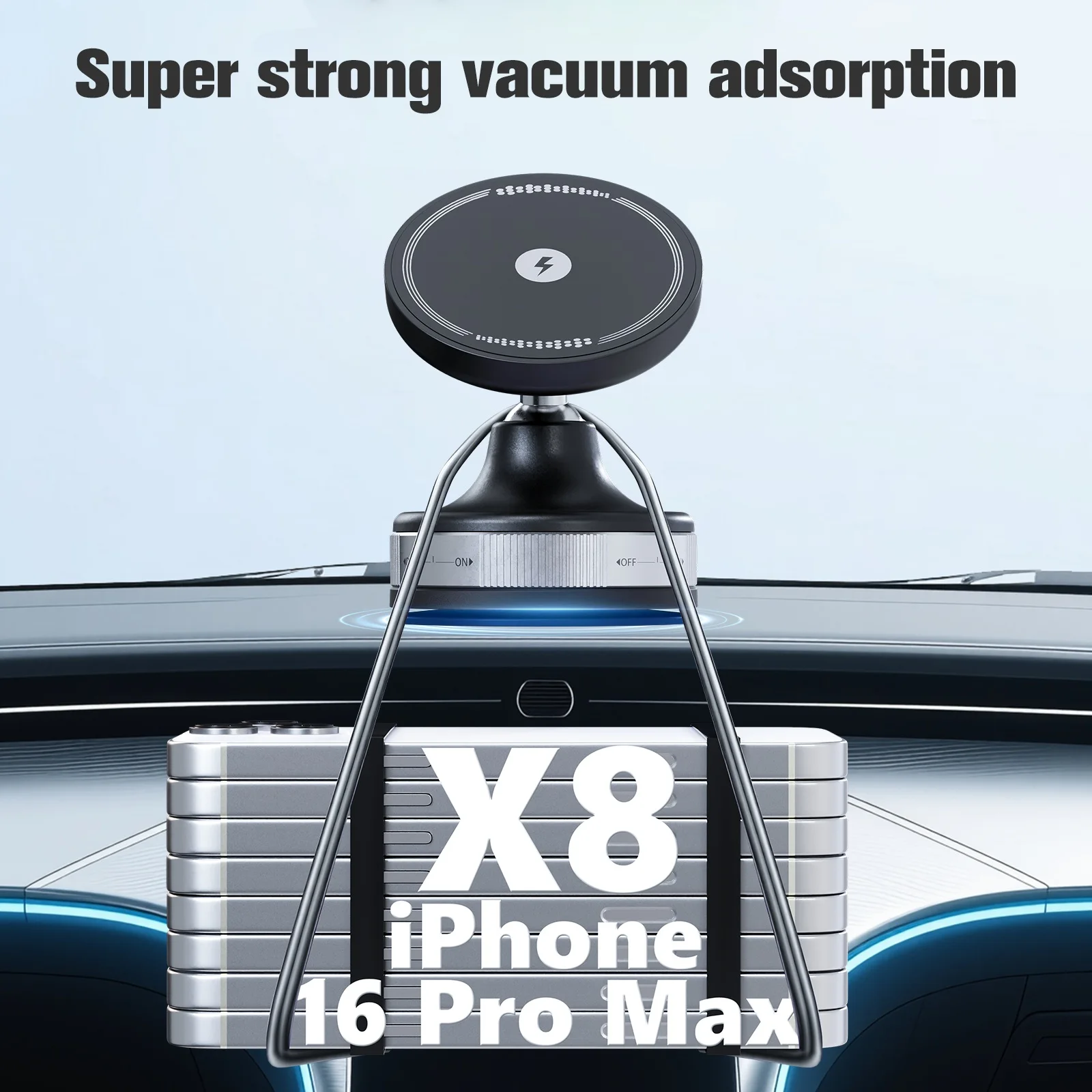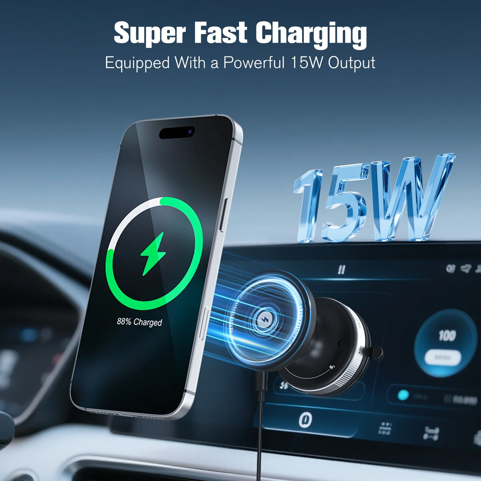 Keep your phone locked in place and charging while you drive. This car mount uses strong vacuum adsorption for a stable hold, plus powerful magnets to keep your device centered while delivering up to 15W fast wireless charging.
