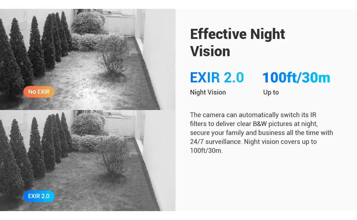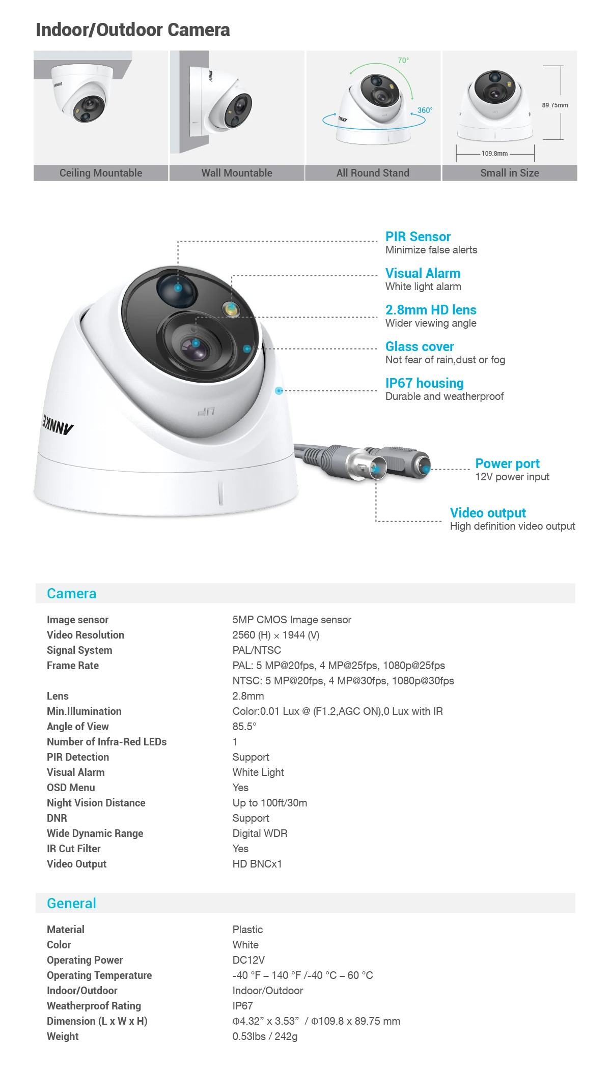 | Supplement Light Range | IR : Up to 30 m, white Light : Up to 20 m |