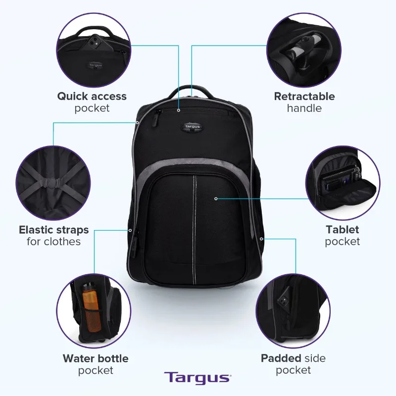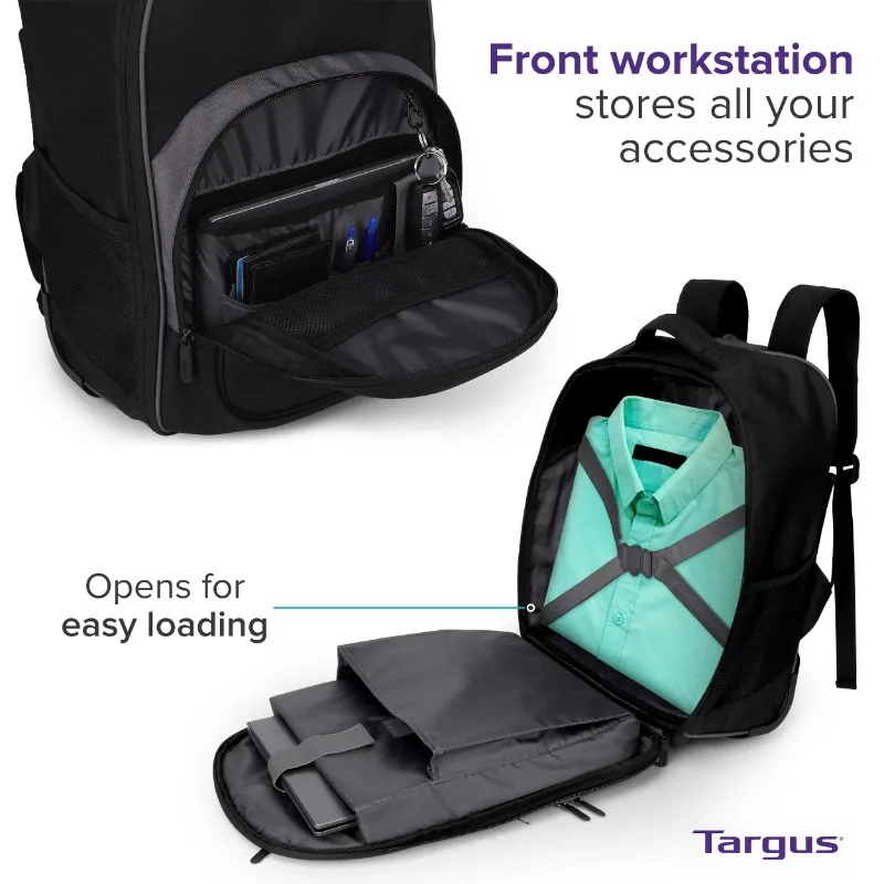 Rolling Laptop Bag: Features a padded compartment to protect your laptop during travel, with a workstation for chargers, tablets, phones, and tech accessories, making it suitable for travel.
