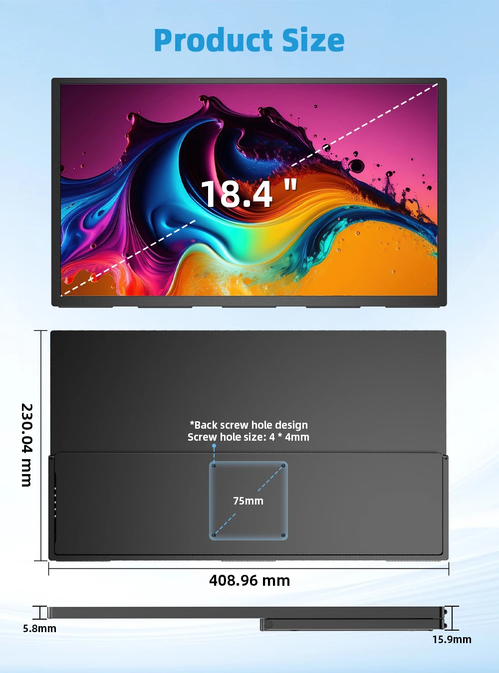 SEO keyword blend: 18.4 inch portable monitor, 18.4 inch 4K portable monitor, QLED portable monitor, UHD 3840×2160 travel monitor, HDR10+ portable display, 100% sRGB portable monitor, matte screen portable monitor, FreeSync portable monitor, VESA 75×75 portable monitor, dual-screen laptop monitor.