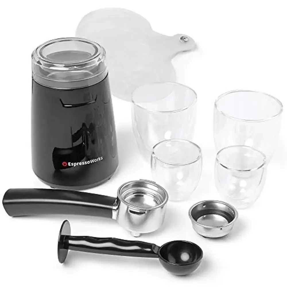- 10-piece set included: Electric coffee grinder, high-quality portafilter with single and double shot baskets, measuring spoon and tamper, two double-walled espresso cups, and two double-walled cappuccino cups.