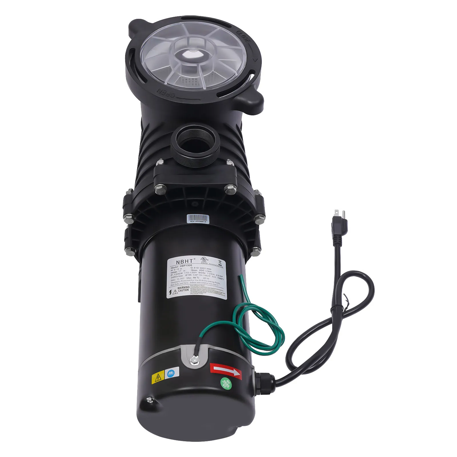 - High Efficiency: The 1500W pure copper motor with 2HP, a high rotation speed of 3450r/min, an efficient impeller, and airflow ventilation allow the pump to achieve a high flow rate (118.8 GPM), ensuring quick and smooth filtration while conserving energy.