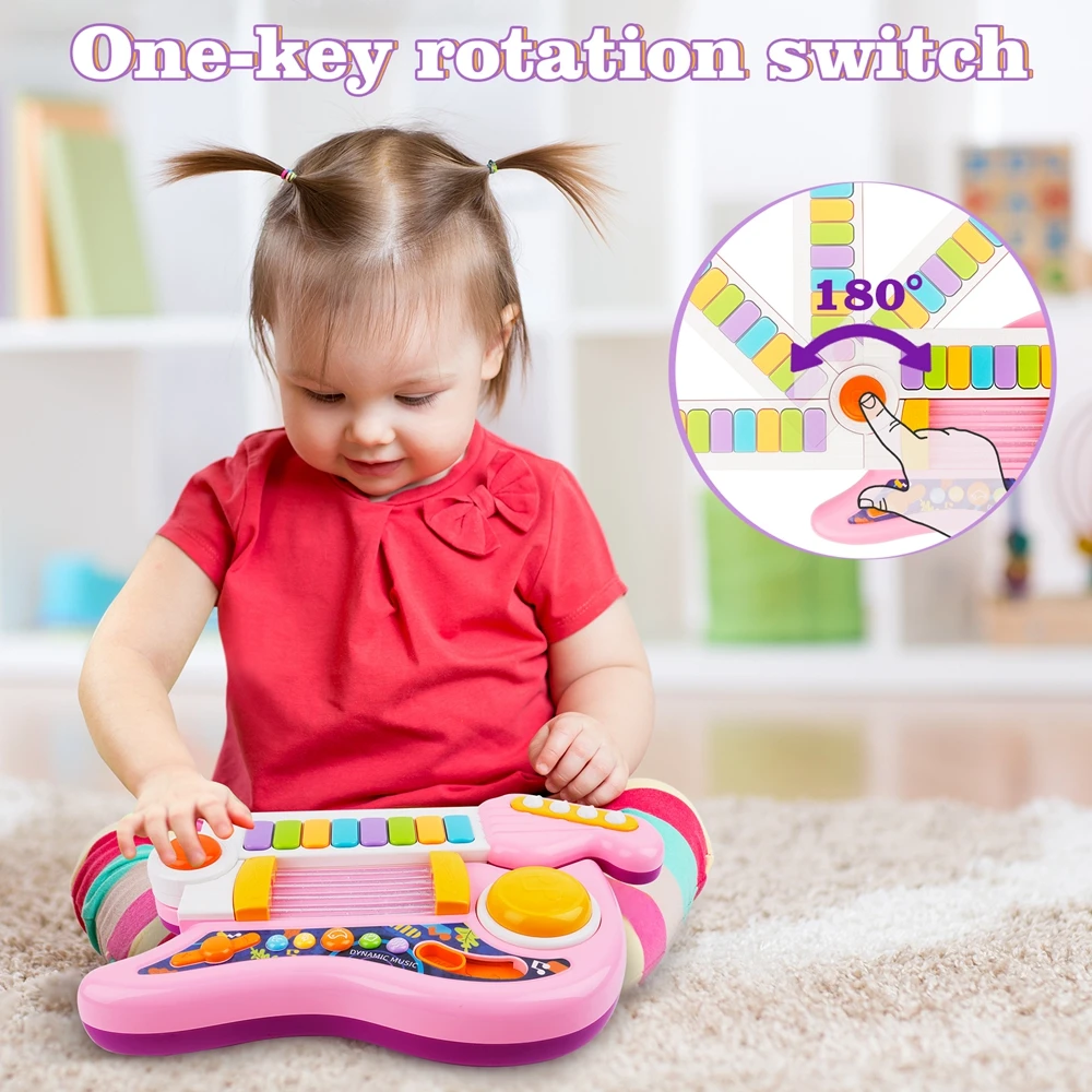 - This musical instrument toy can be played as a kid’s guitar or a baby piano.