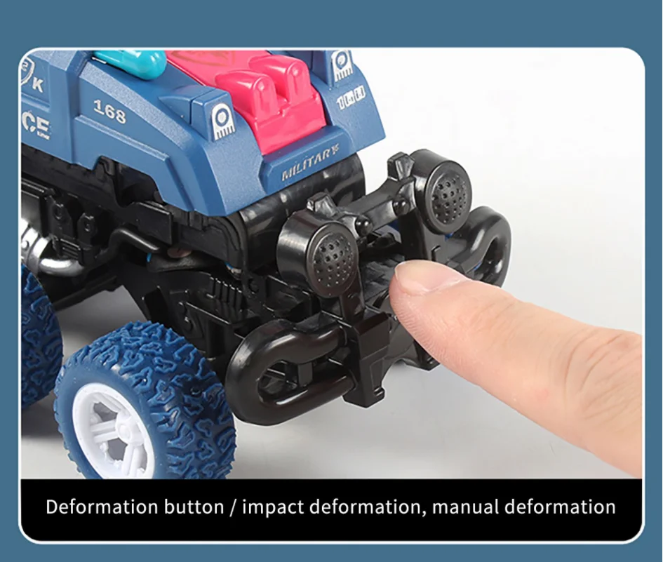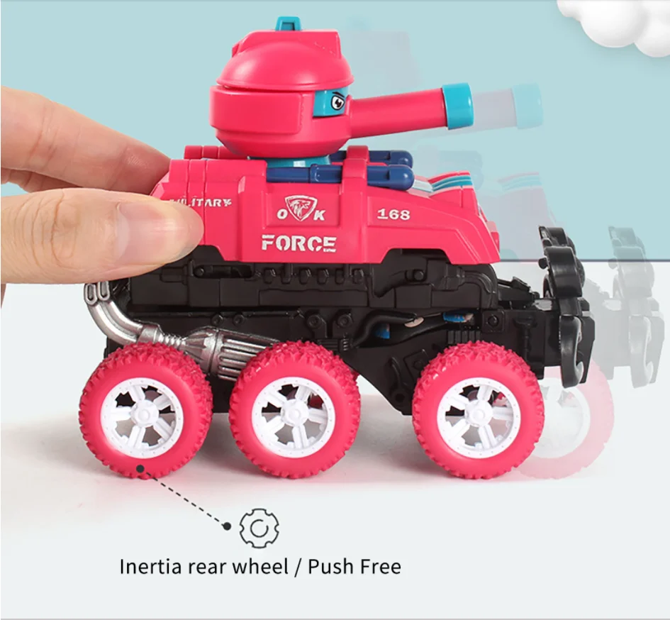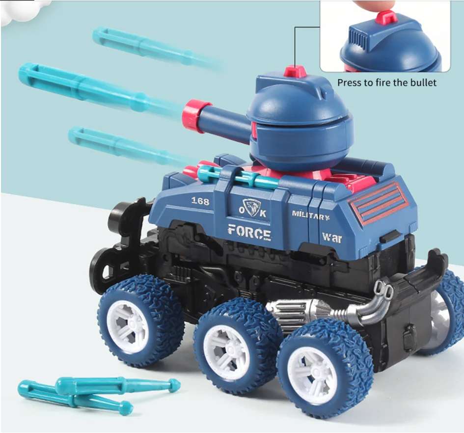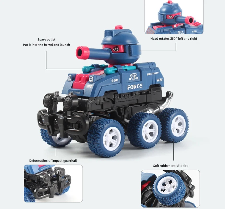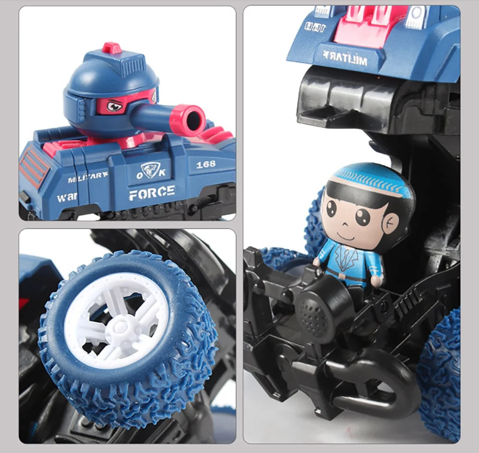 Two-in-one Toy Car: Upon impact, the front wheel of the tank triggers an immediate transformation into an exciting spinning stunt car, offering dual functionality and added fun.