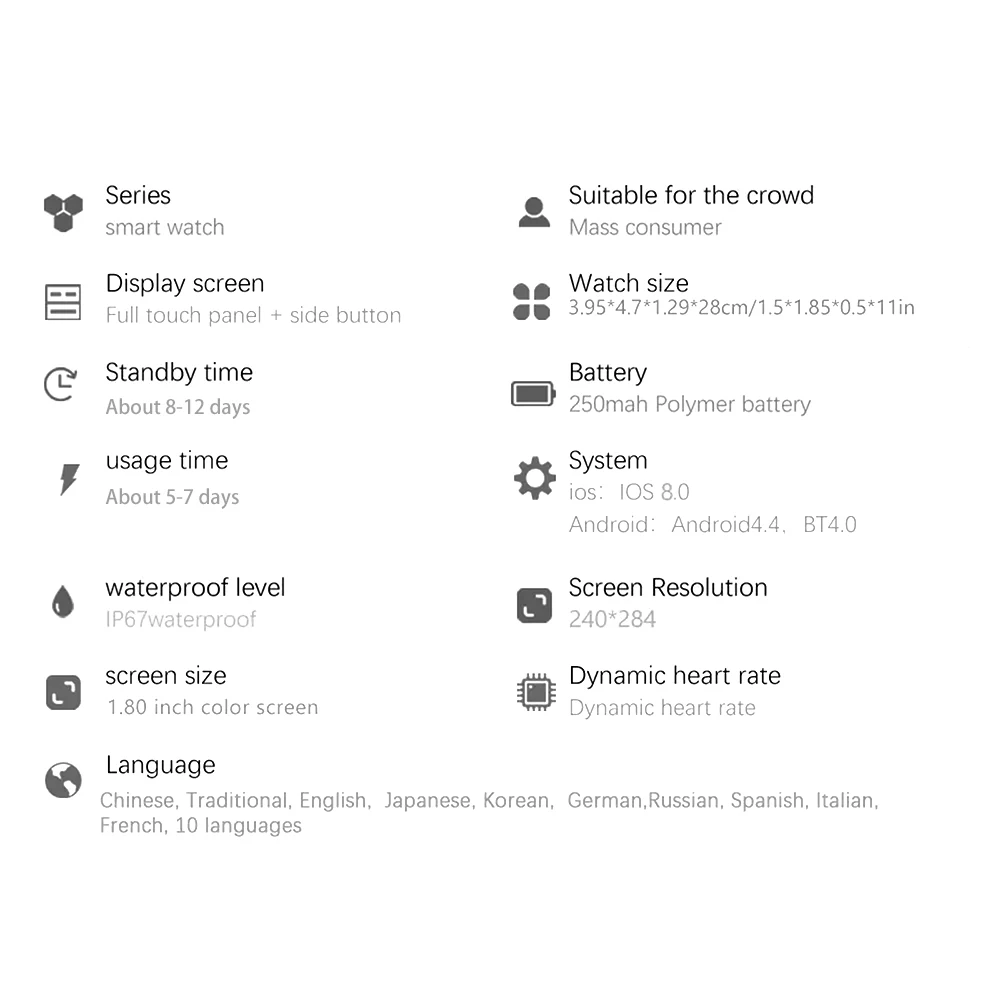 - Watch/charging compartment battery capacity: 250mAh polymer lithium battery
