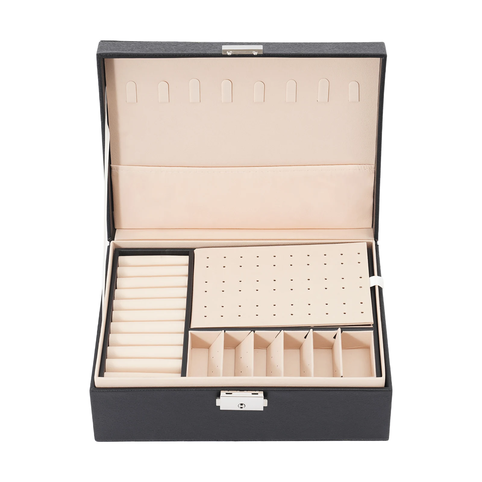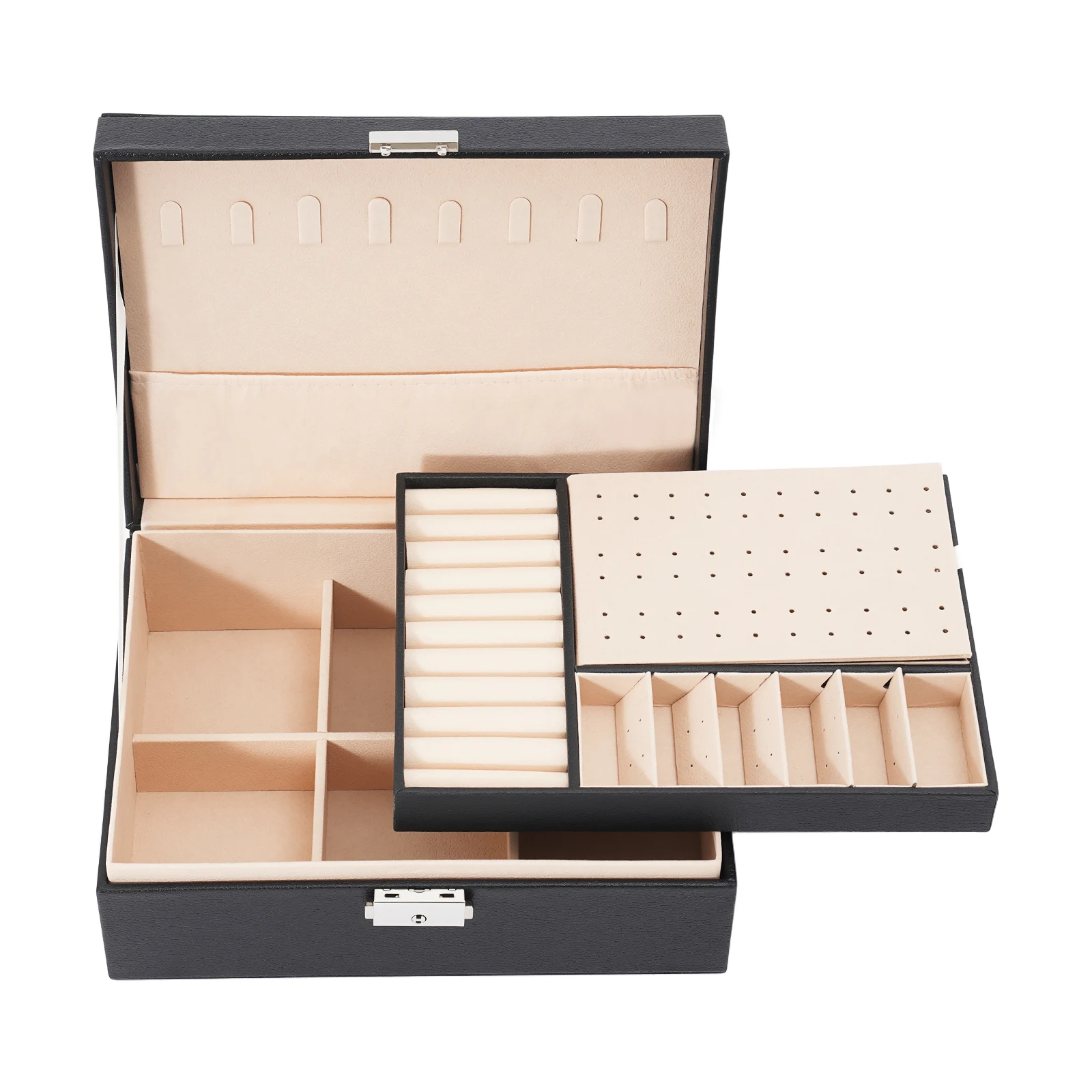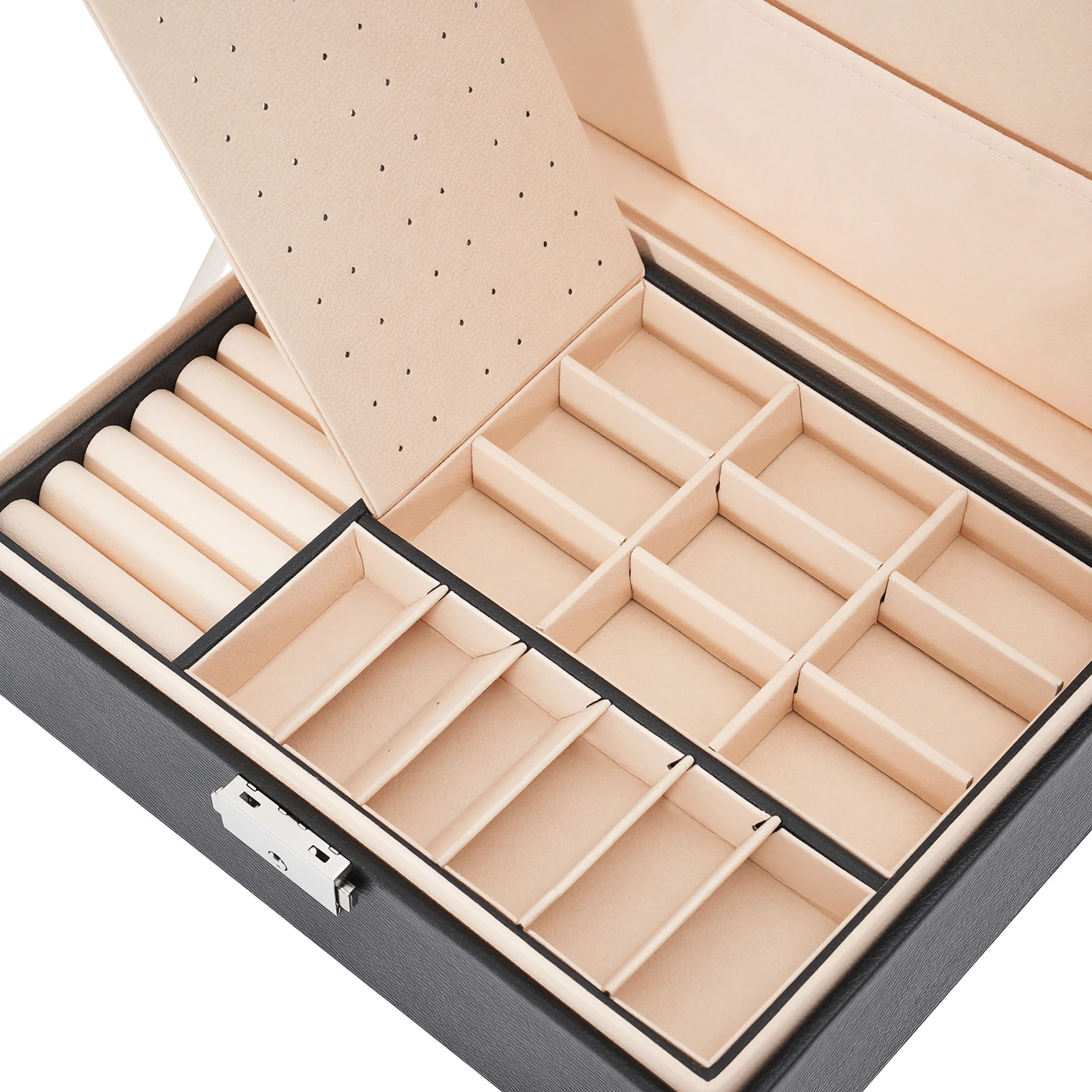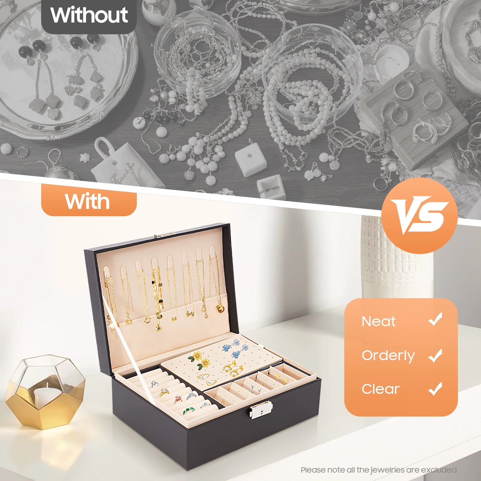 - Two-tier storage: Includes ring slots, necklace hooks, a small pocket, and earring slots so each item has its place.