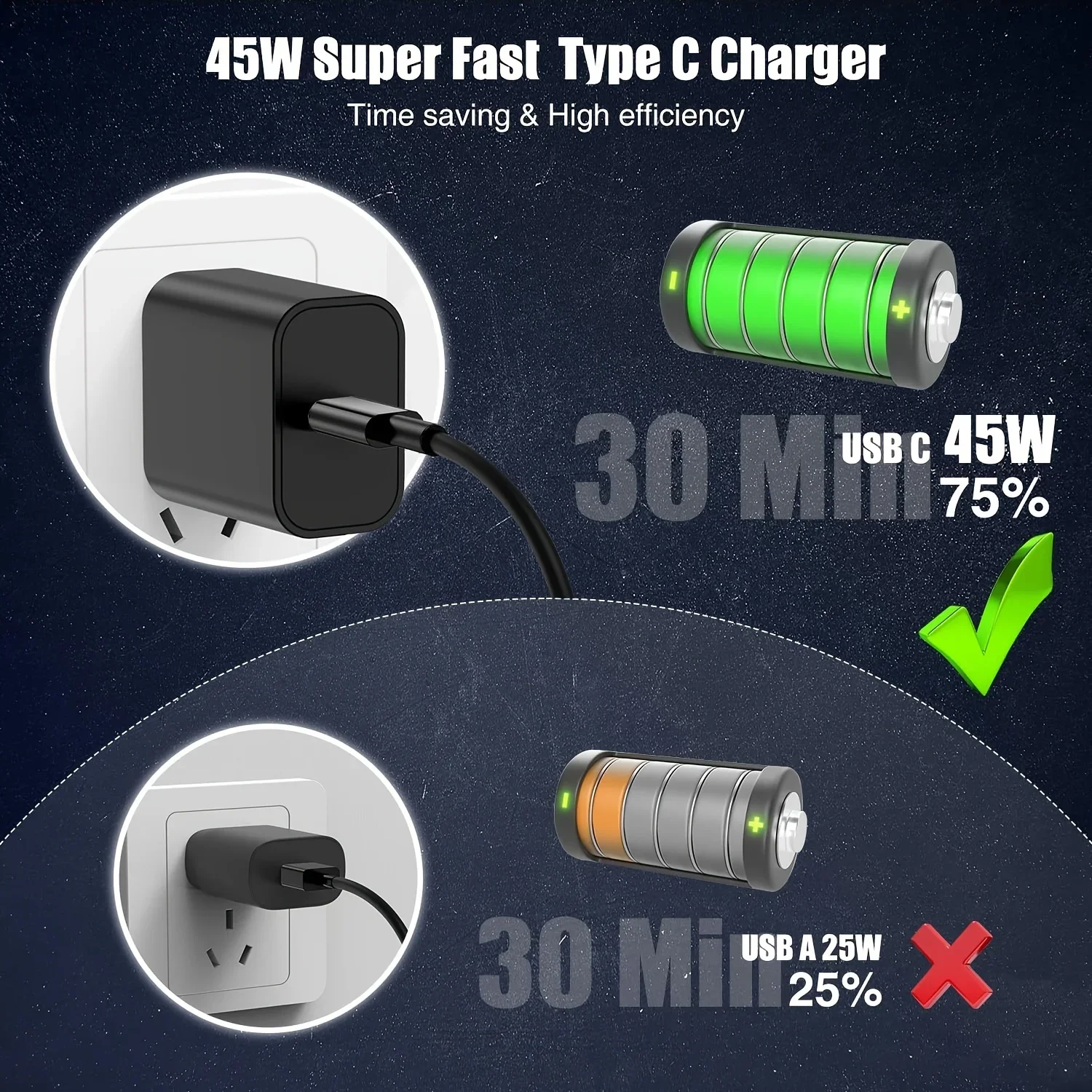 Power up faster with this 45W USB-C Power Delivery charger and cable set built for quick, efficient charging. The product images show a 45W USB-C fast charging comparison that reaches about 75% in 30 minutes versus a lower power USB-A option that reaches about 25% in the same time, making this a strong choice for everyday charging needs.