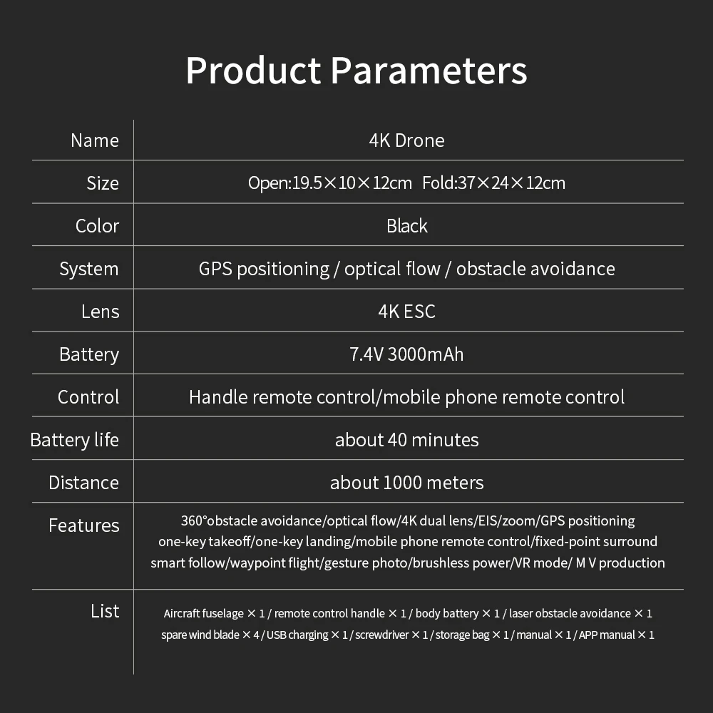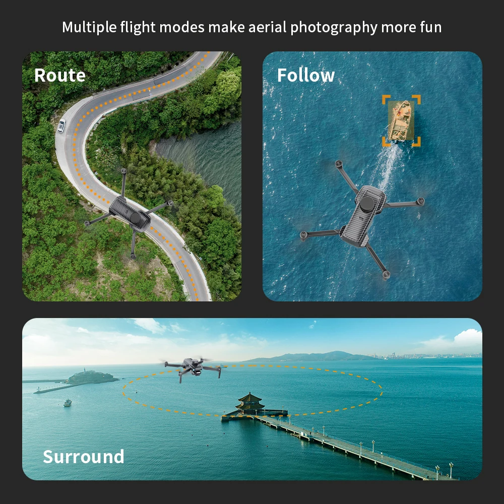 - Advanced Flight Modes: Includes intelligent following, surround flight, palm control, real-time map positioning, out-of-control map planning route, APP mobile control, one-click return, headless mode, ascent and descent, forward and backward, left and right side flight, and automatic switching between optical flow/GPS.