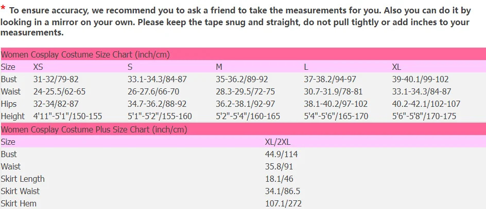 Women Cosplay Costume Plus Size Chart (inch/cm)