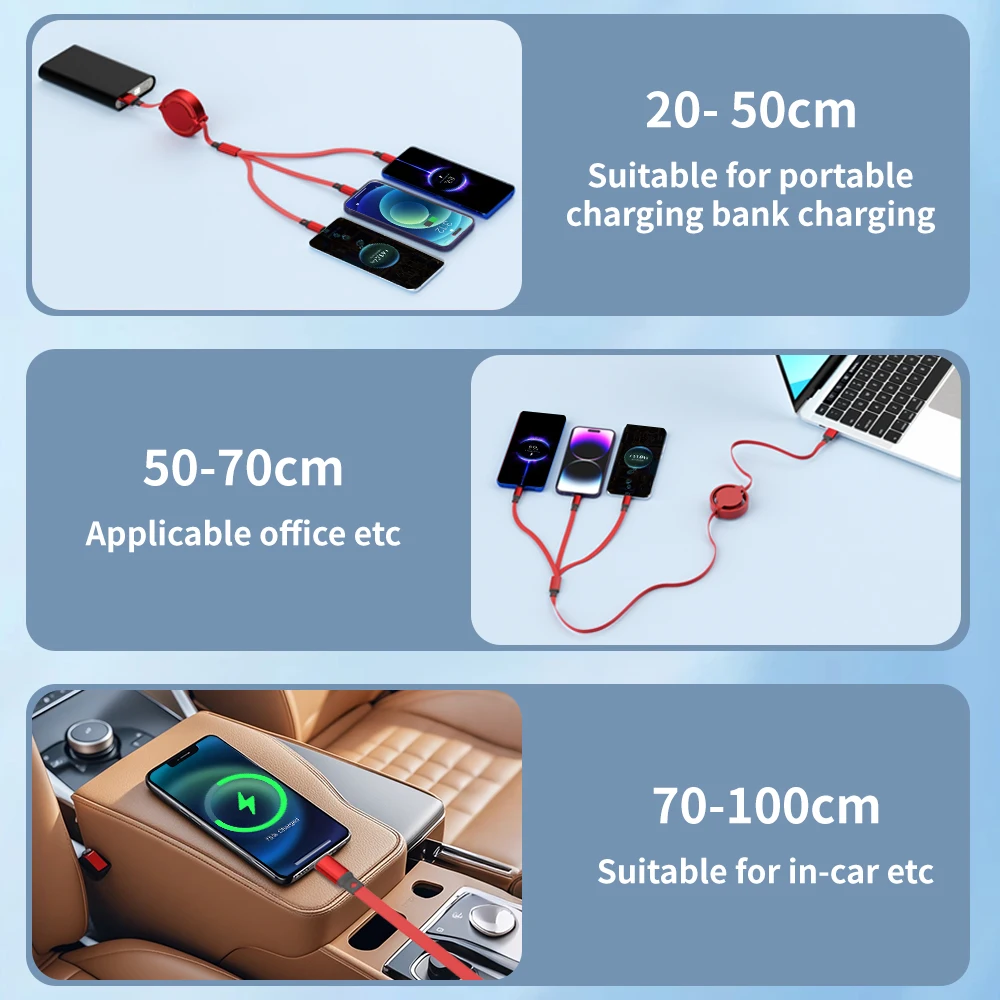 This multi-connector cable is designed to support a range of devices with iP, Type-C, and Android-style charging interfaces, shown in the product images. The retractable design allows you to extend the cable as needed for different charging situations while helping keep your space cleaner and more organized. The images also show multiple extension points, including 35cm, 60cm, 85cm, and 100cm, giving you flexible reach depending on where and how you use it.