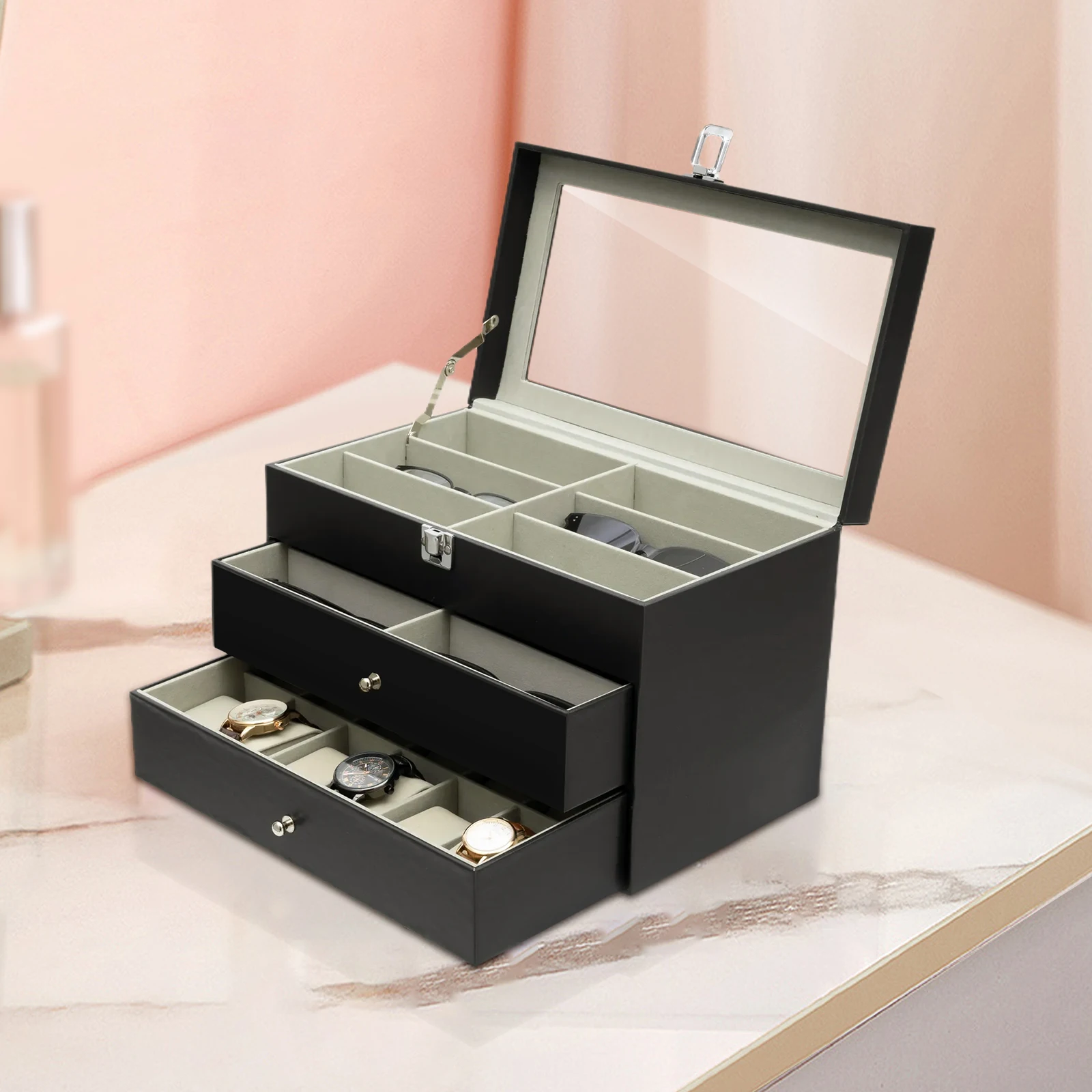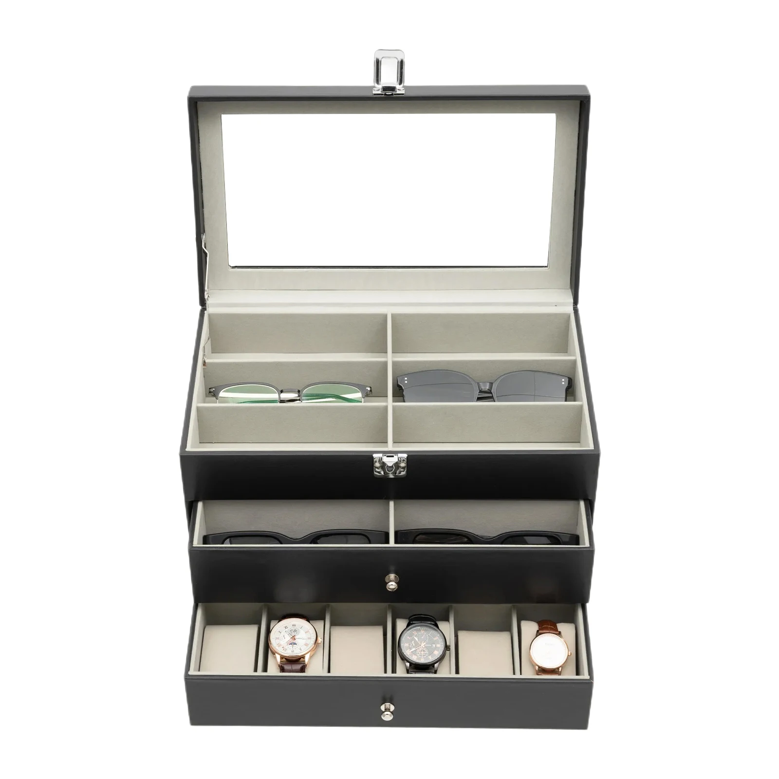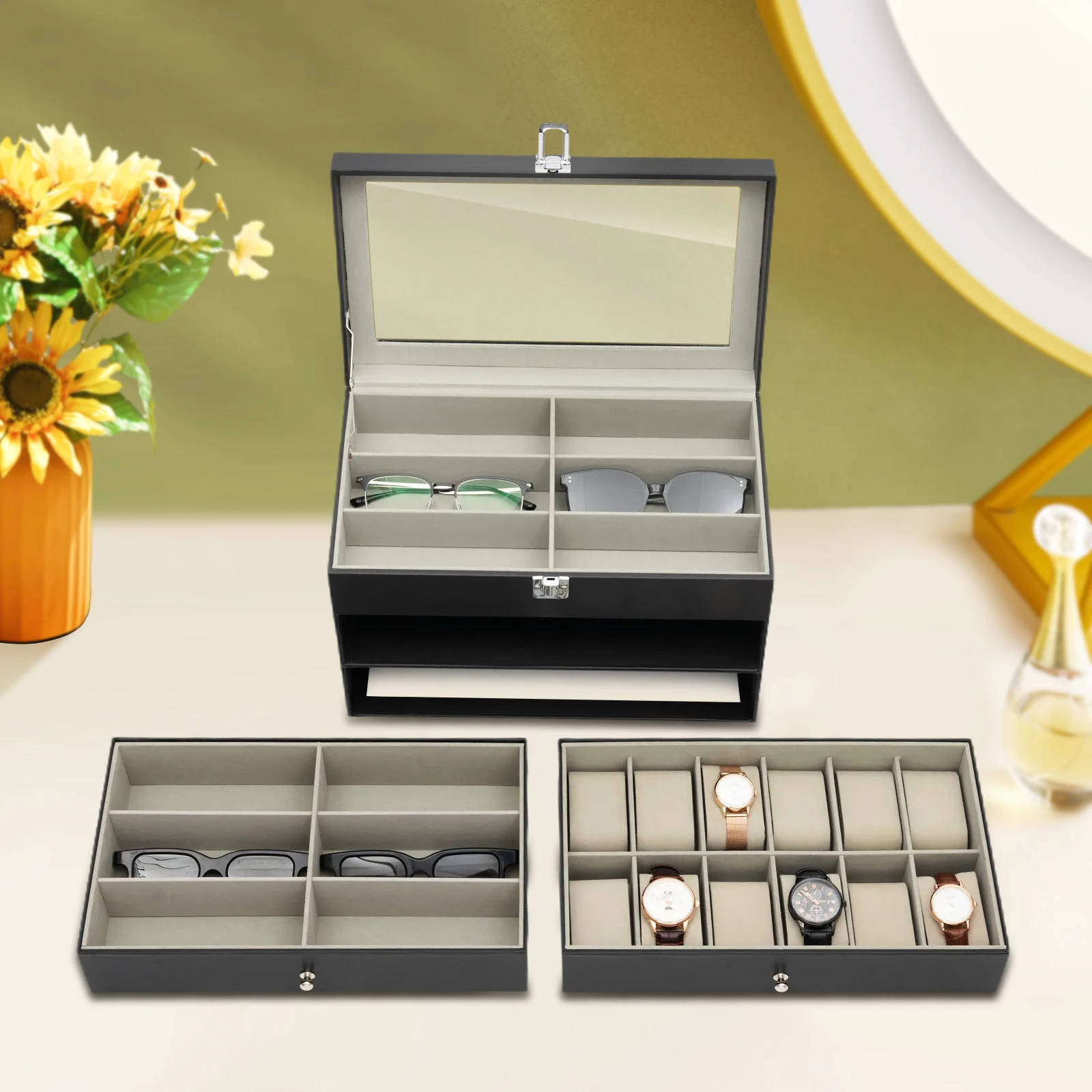 Three-layer storage box: the first and second layers each have 12 compartments for glasses, and the third layer includes 12 detachable velvet pillows for watches. It’s designed to meet everyday storage and display needs.