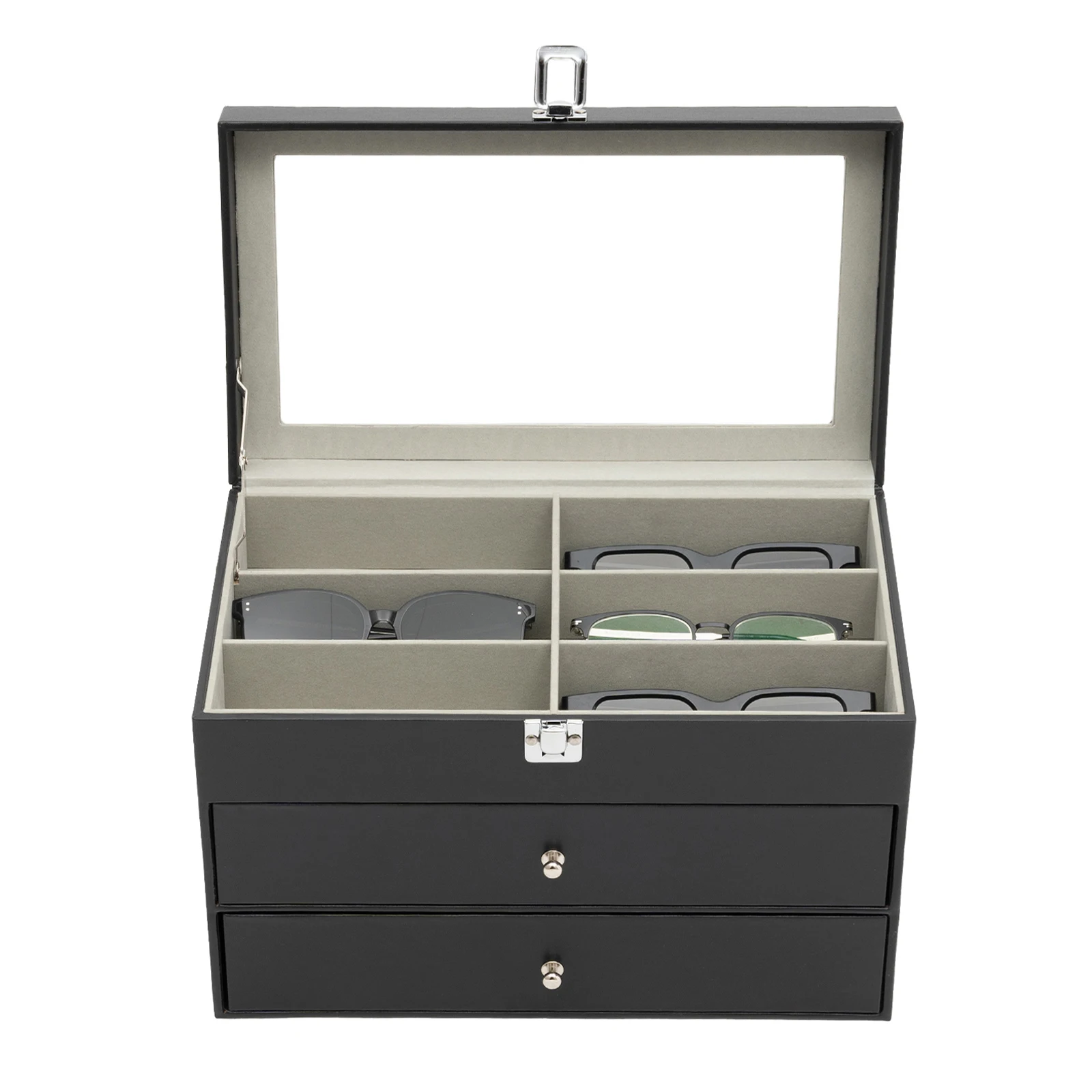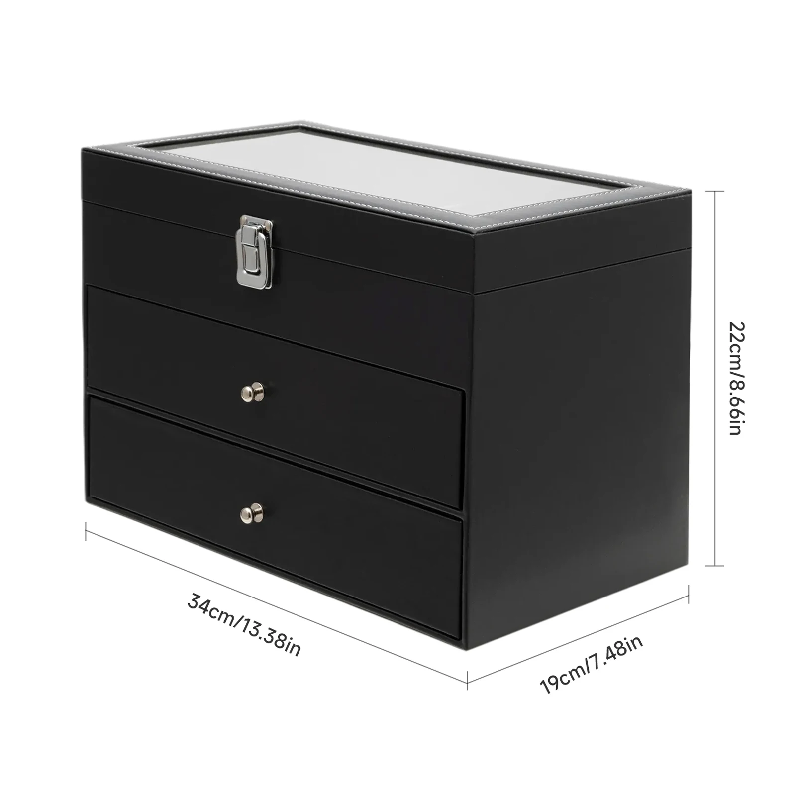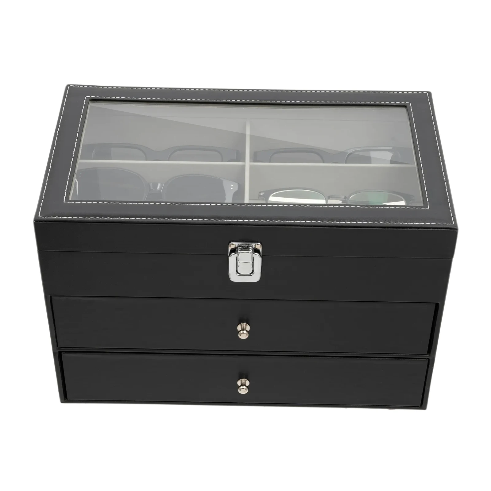 Three-layer storage box: the first and second layers each have 12 compartments for glasses, and the third layer includes 12 detachable velvet pillows for watches. It’s designed to meet everyday storage and display needs.