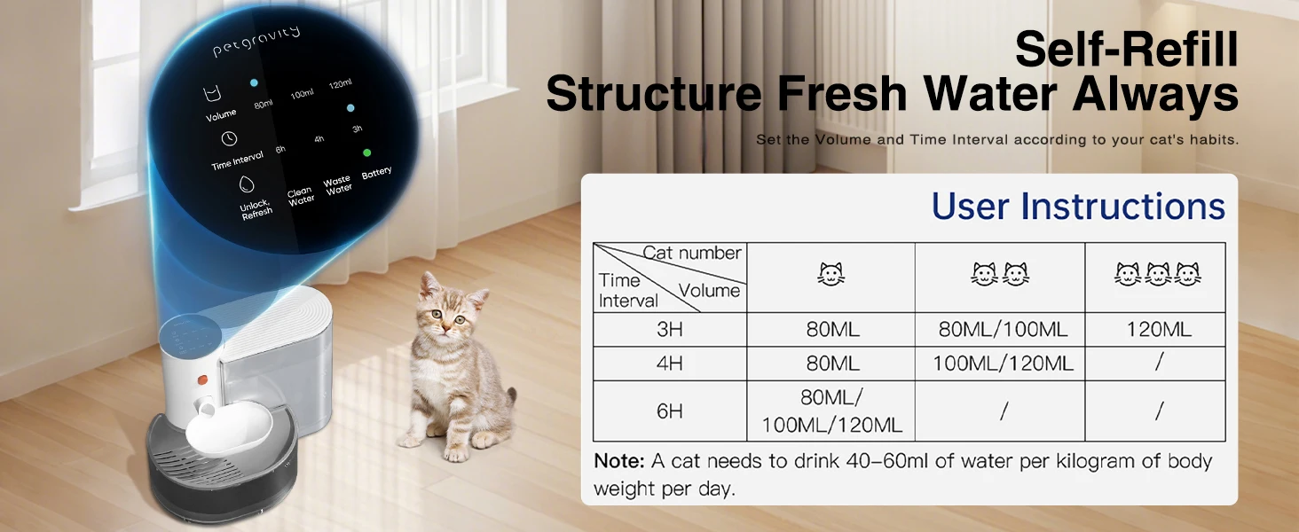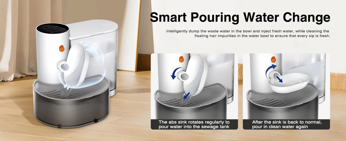 • 🌟 Smart & Safe – Automatic Water Change System Customizable settings: Adjust water output & frequency to match your pet’s drinking habits. Water & electricity separation: No risk of electric shock. Smart alerts: Get notified when water is low or the sewage tank is full.