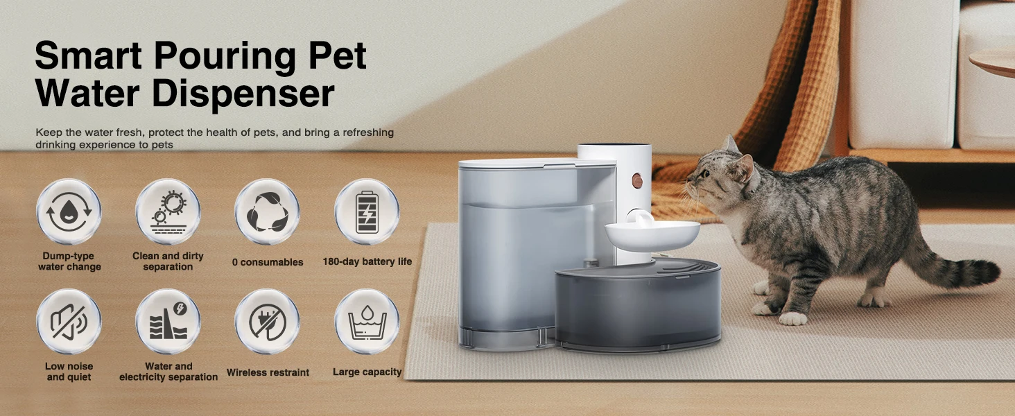 🌟 Smart & Safe – Automatic Water Change System Customizable settings: Adjust water output & frequency to match your pet’s drinking habits. Water & electricity separation: No risk of electric shock. Smart alerts: Get notified when water is low or the sewage tank is full.