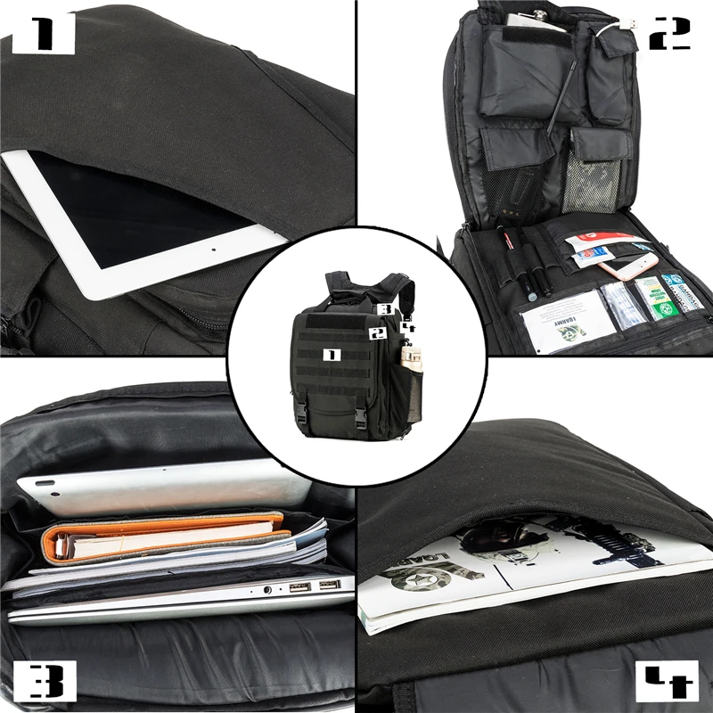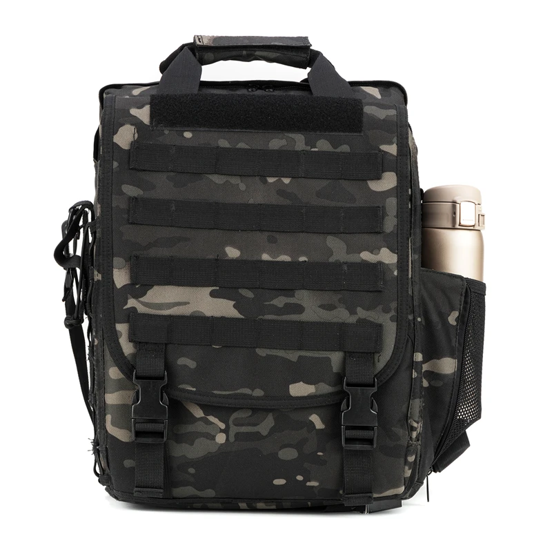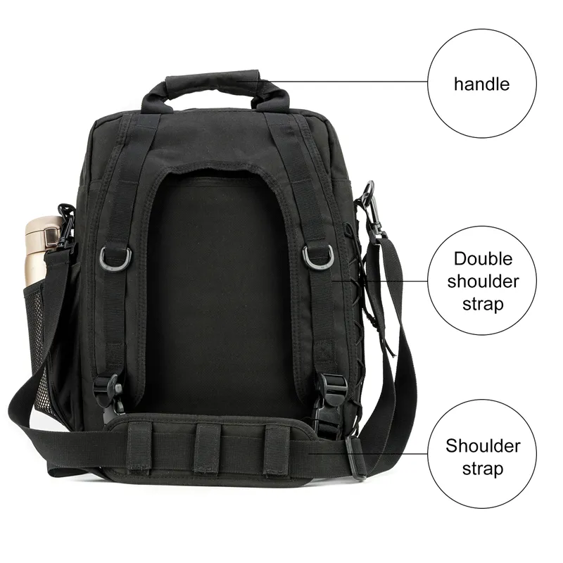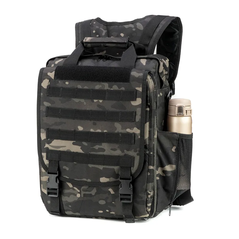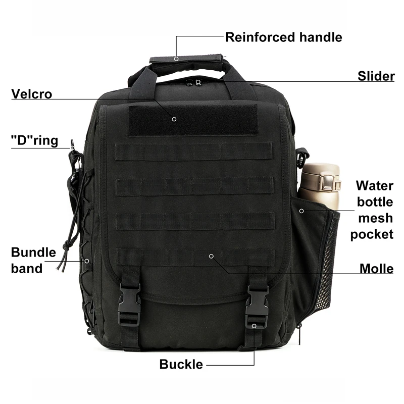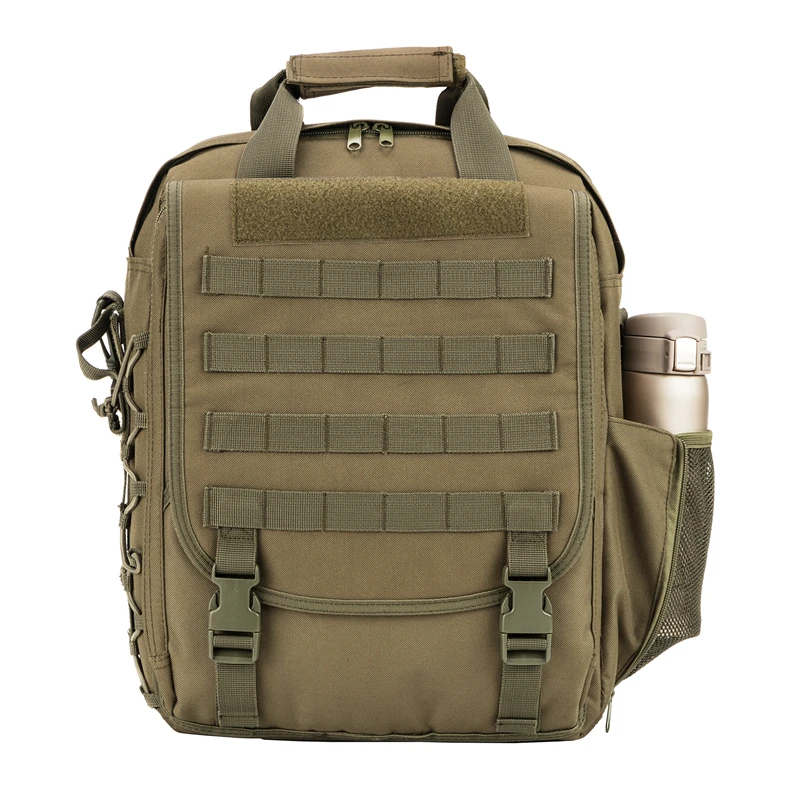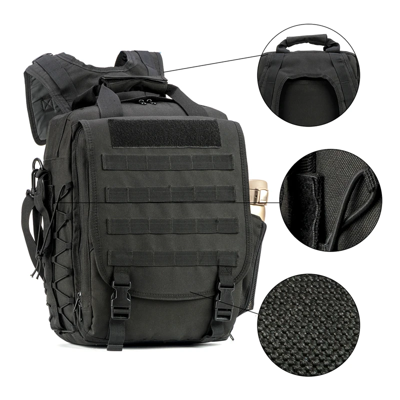 Multi-function military laptop backpack/bag designed with fast-release buckles and zipper closure. It is equipped with straps for carrying on one or both shoulders and features a reinforced 1.5-inch wide grab handle on the top. This water-resistant military computer bag is built for sturdy construction and superb load-carrying comfort, with multiple compartments for organizing small and medium-sized items. Its sleek design makes it versatile for almost any setting.