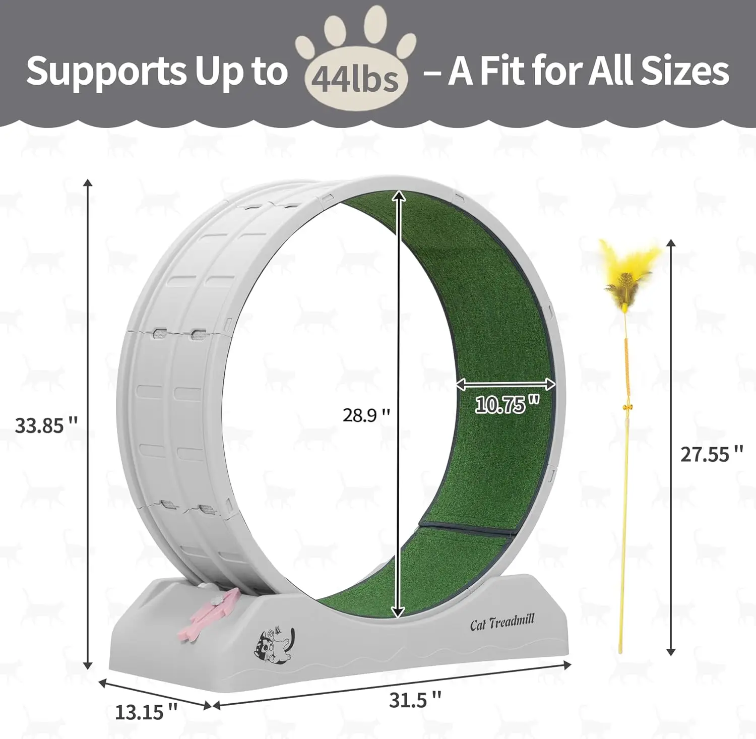 Safe and Sturdy Cat Wheel: Made of upgraded PP that is pet-friendly and solid, the large pet activity wheel is strong enough to support up to 50 lbs and is durable for long use. The matching base keeps the wheel secure from sliding.