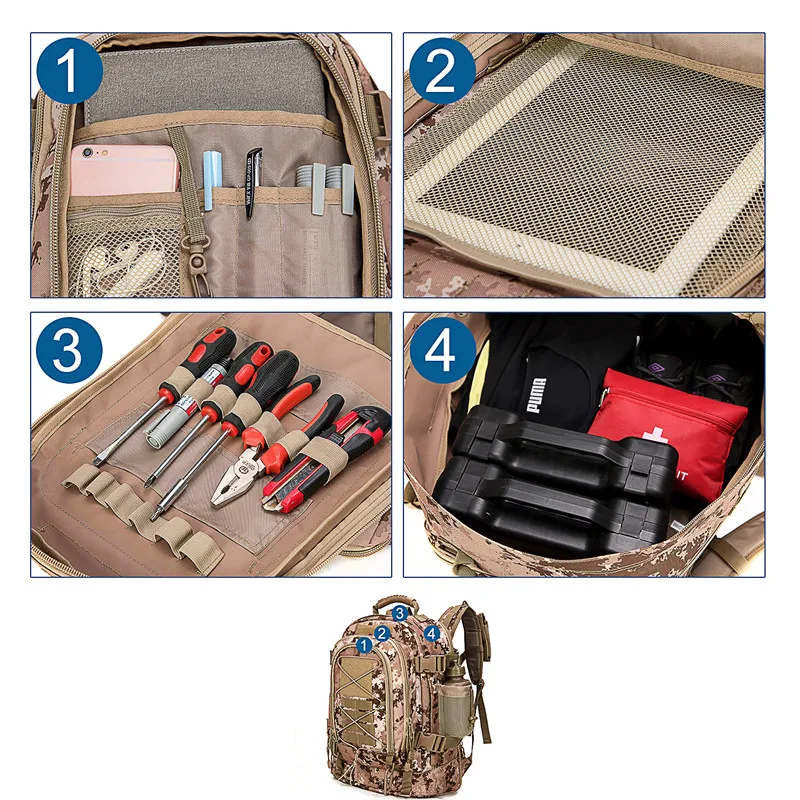 The Tactical Backpack also excels in versatility. Its camouflage pattern is not only practical for blending into