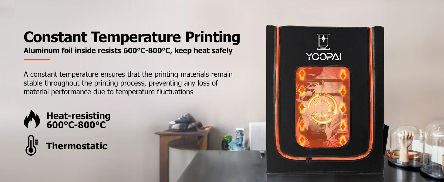 - Constant Temperature Printing for Material Stability: Achieve consistent, high-quality prints thanks to the enclosure’s advanced insulation. An aluminum foil interior boasts impressive heat-resisting and thermostatic properties (resisting 600℃-800℃), preventing material performance loss due to temperature fluctuations and ensuring a stable environment throughout the printing process.