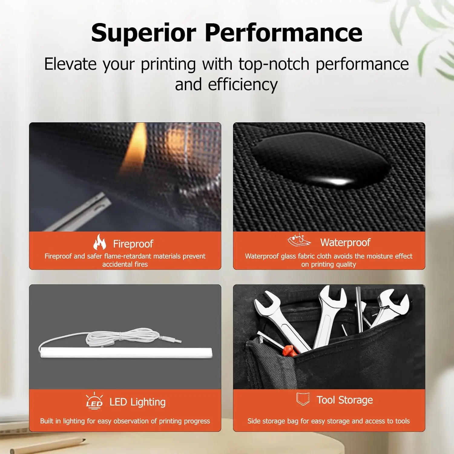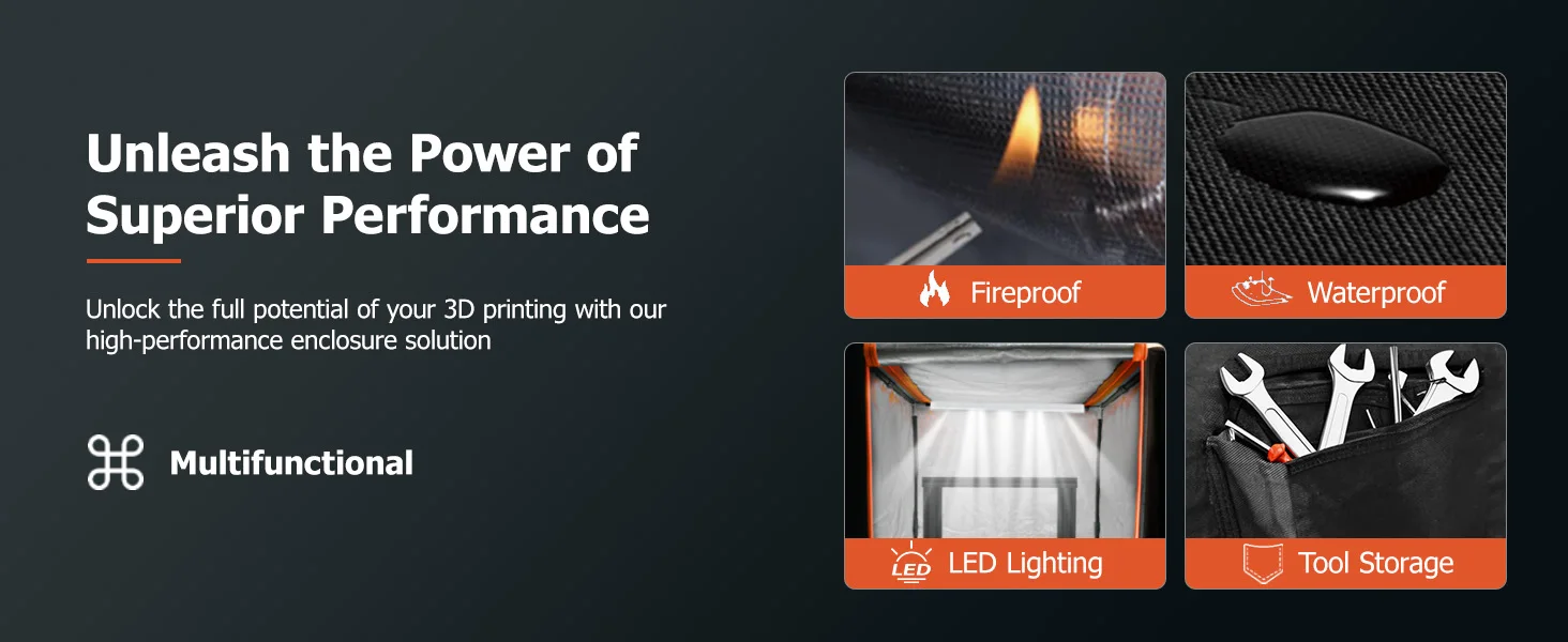 - Enhanced Safety with Fireproof & Waterproof Design: Print with peace of mind. Crafted from safer flame-retardant materials, this enclosure helps prevent accidental fires. The waterproof glass fabric cloth also protects your printer from moisture, ensuring printing quality remains unaffected even in varied environments.