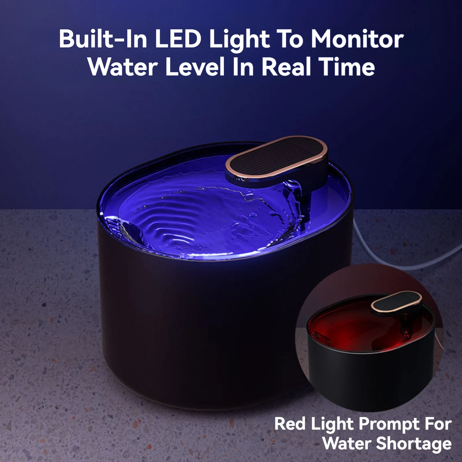 Automatic Alert: The fountain emits a soothing blue light during normal operation, creating a calming atmosphere at night. When the water level is low, it stops automatically, and the light turns red to remind you to refill it, ensuring your pet always has access to water.