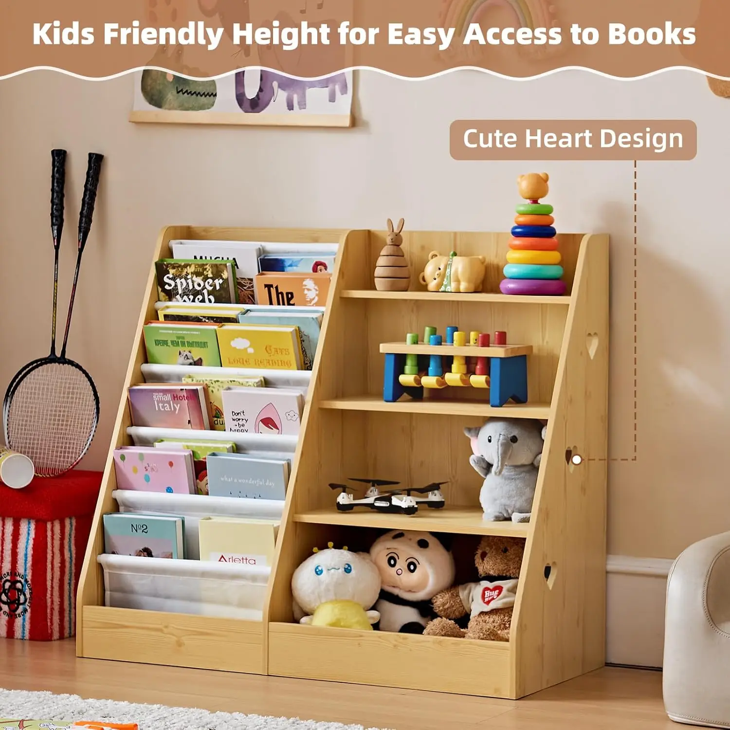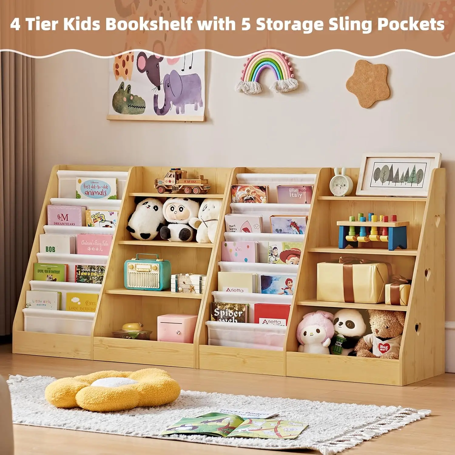 This wooden bookshelf features 4 sturdy tiers and 5 deep sling pockets, offering plenty of organization space for kids’ books. The cloth bag design displays book covers forward, making it easier for children to view and choose their favorite reads. It creates a practical, neat, and attractive storage solution that helps encourage reading habits while keeping the room tidy.