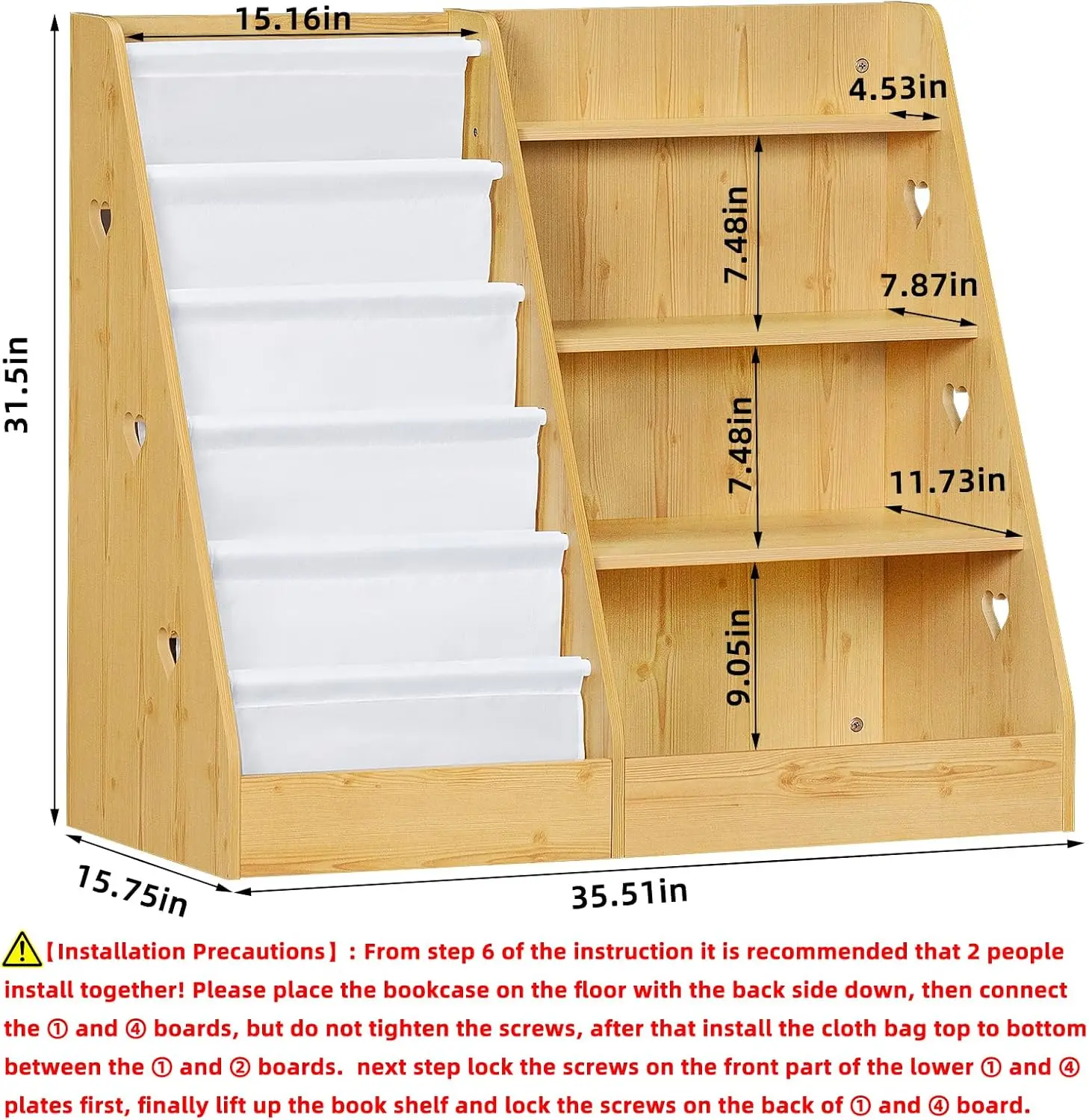 Dimensions: 35.51 inches wide x 15.75 inches deep x 31.5 inches high. The bookshelf is designed with charming heart shapes on both sides, adding a playful touch to any room. Its height is ideal for children, allowing them to reach and return books easily without help. All screws are hidden internally for a cleaner appearance, and the rounded edges help prevent bumps and injuries. Made from strong materials with a child-safe design, this bookcase is built for both durability and everyday safety.