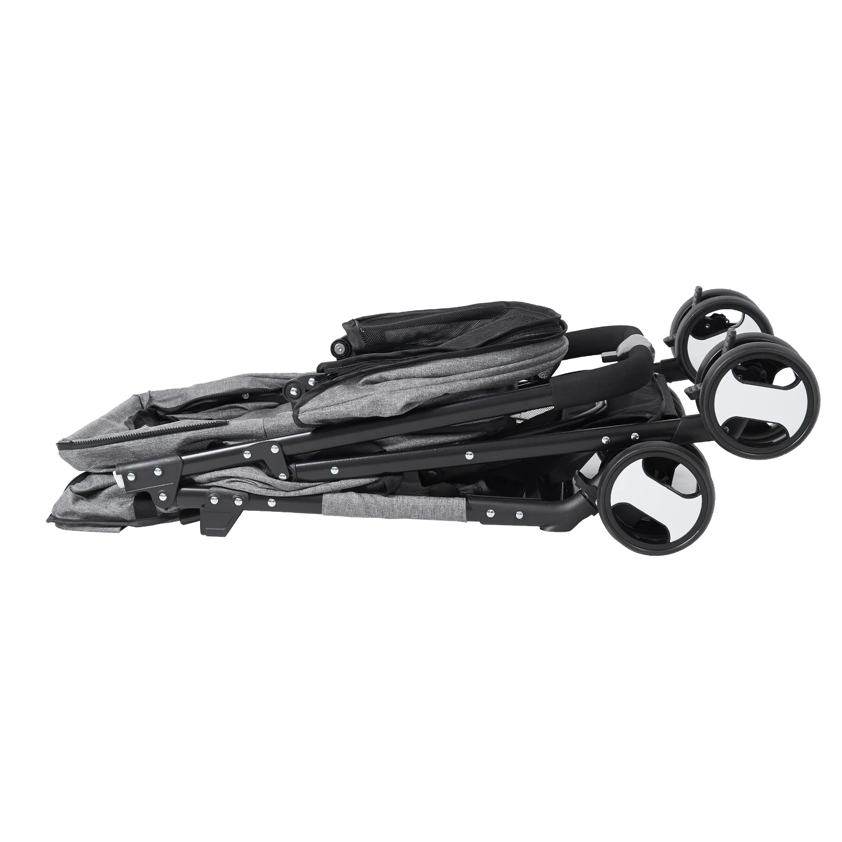 The one press folding mechanism allows the trolley frame to collapse quickly with one hand and requires no tools. Its compact design makes it easier to store in a garage, closet, or car trunk for travel and outdoor trips. The stroller is detachable, allowing the pet compartment to be removed and used as a pet carrier.