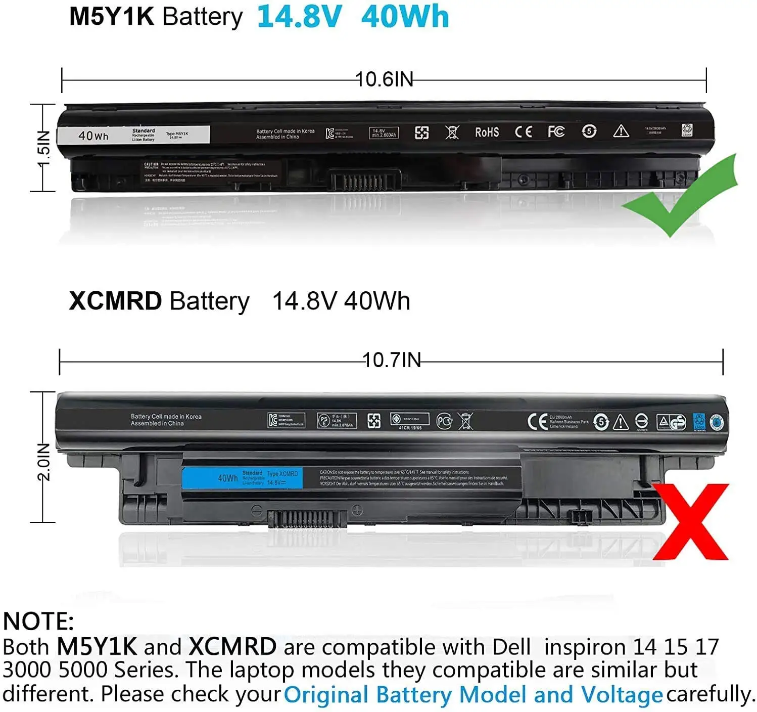 This M5Y1K battery fits Dell M5Y1K 14.8V 40Wh models and is a perfect replacement for Dell Inspiron 3567 and 5559 Laptops.