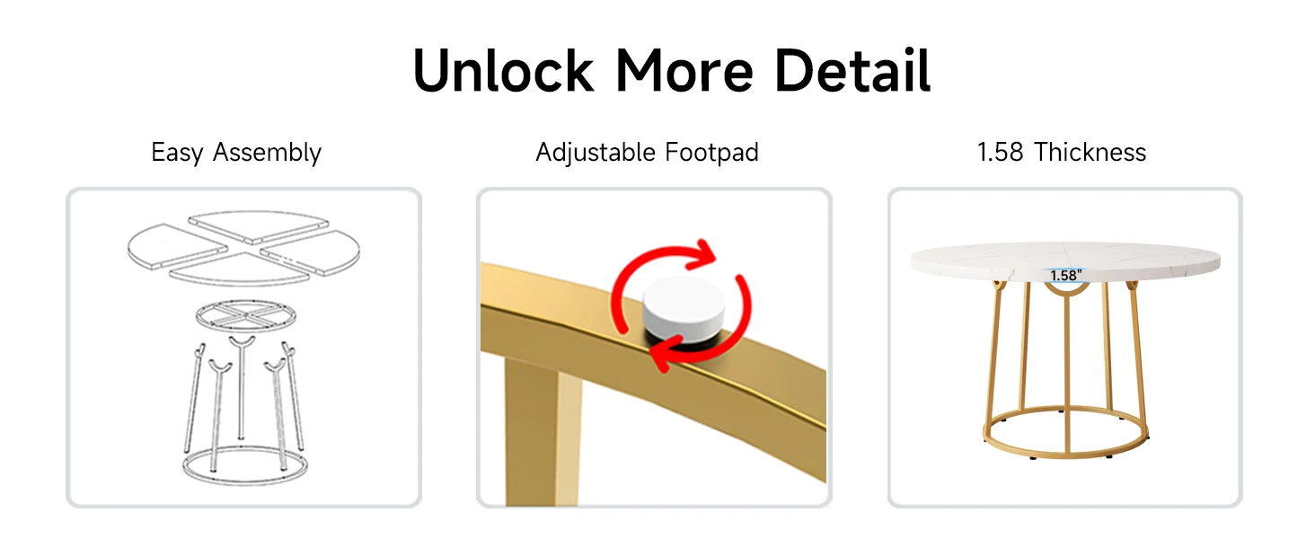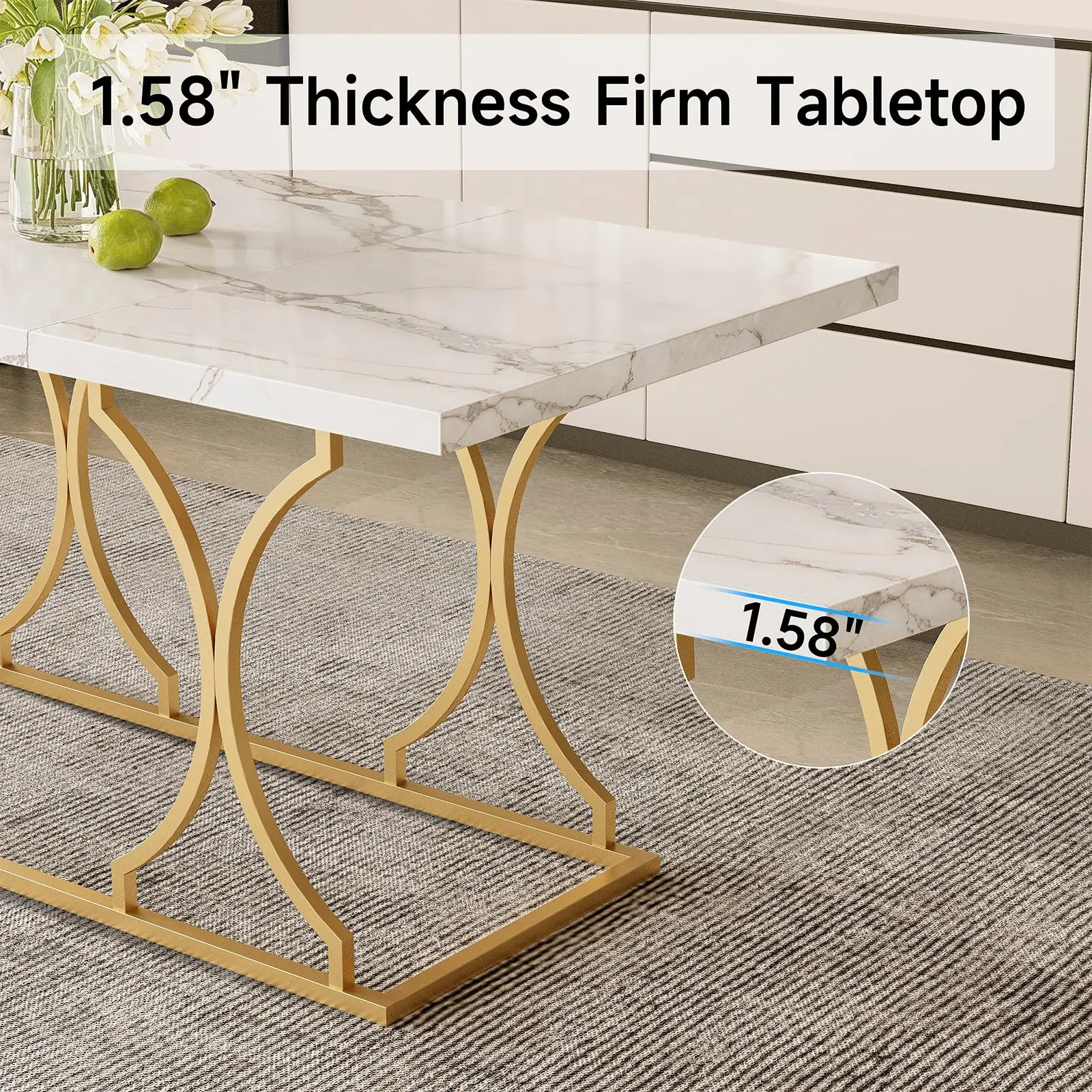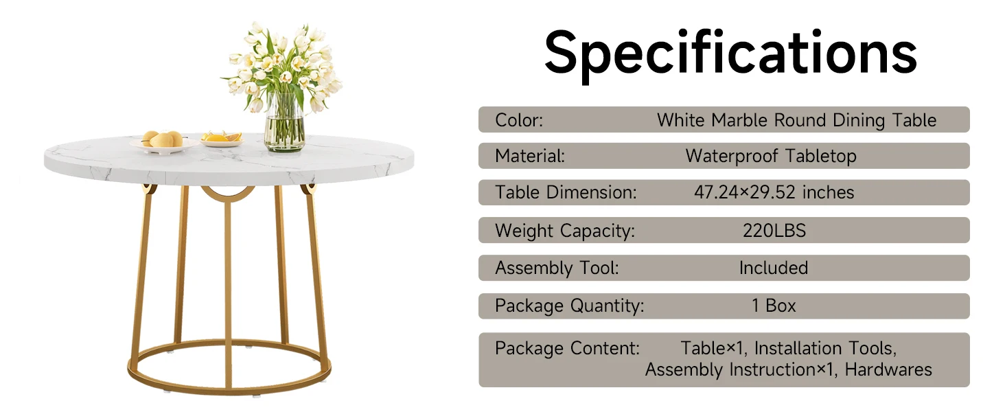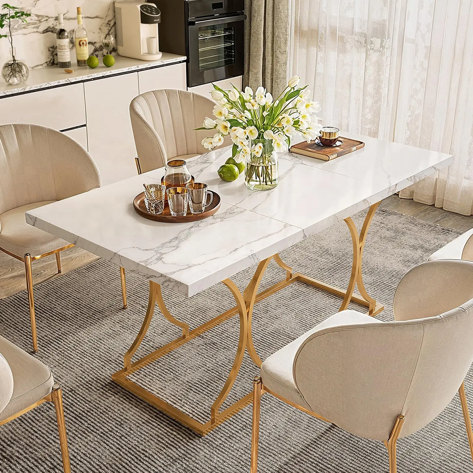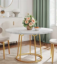 - Elegant design: This round dining table features a white faux marble wooden tabletop and a unique gold metal base. Its modern, glamorous style blends easily with existing décor and adds a touch of luxury to your dining space.