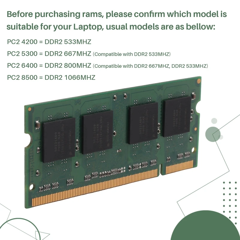 Please verify your laptop’s supported memory type, frequency, and pin layout before purchase. DDR2 laptop memory uses 200 pins, while other memory generations use different pin counts and are not interchangeable. Product brand, batch number, and board appearance may vary by stock, but this does not affect normal function.