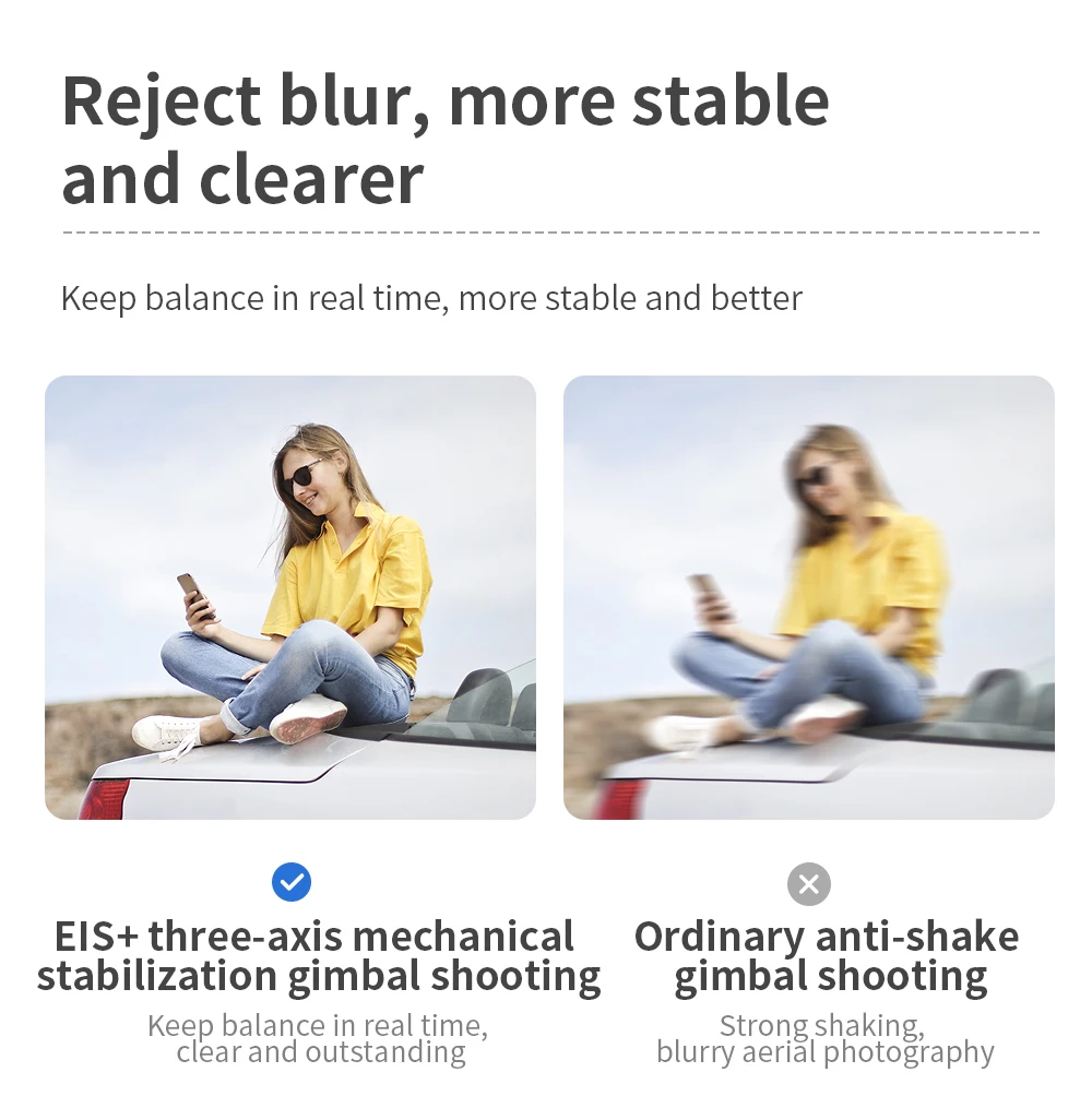 - Three-axis mechanical stabilization gimbal + EIS electronic stabilization for anti-shake 4K image