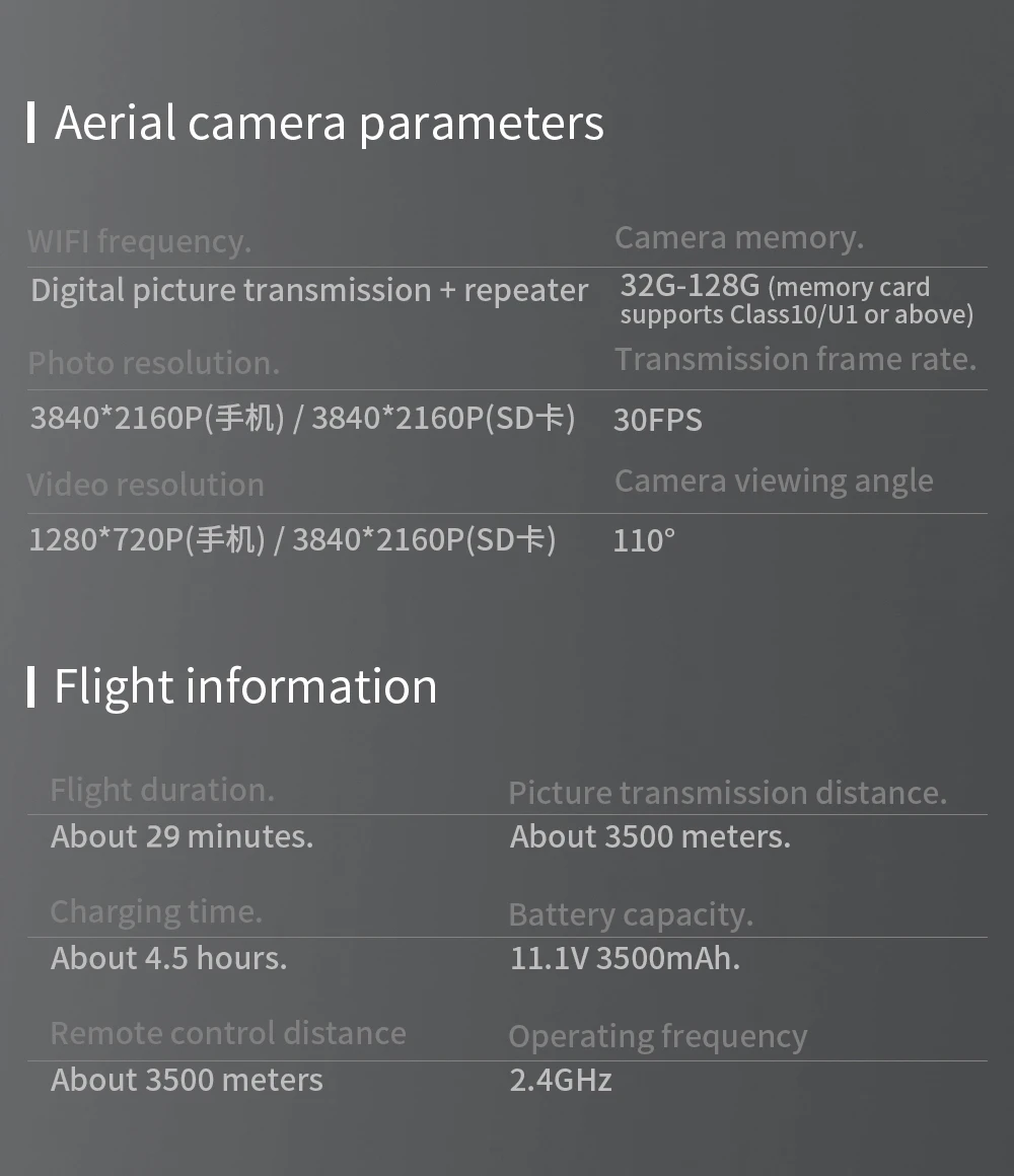 - Wifi Image Transmission Distance: 3500m (Outdoor and unobstructed, depending on conditions and mobile device)