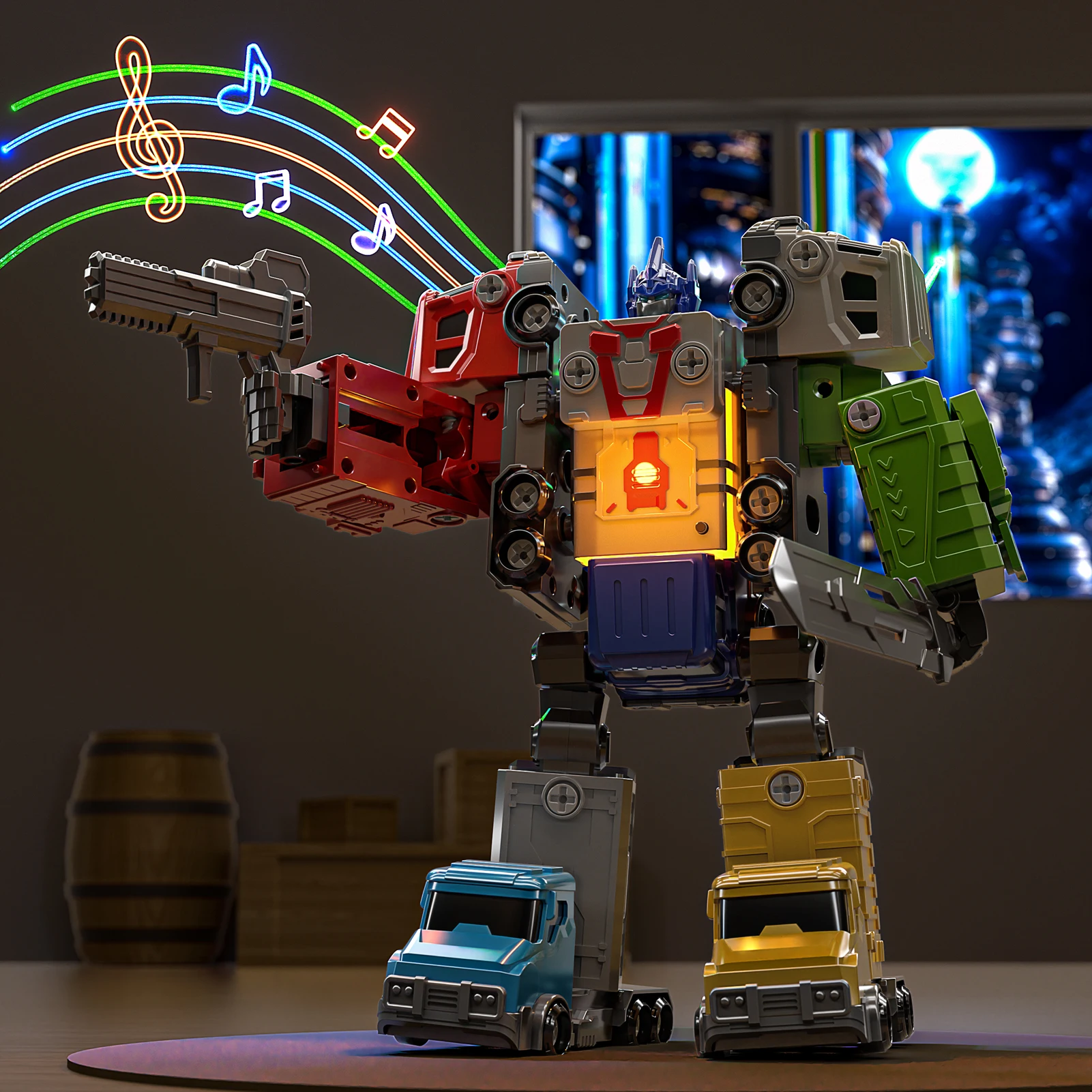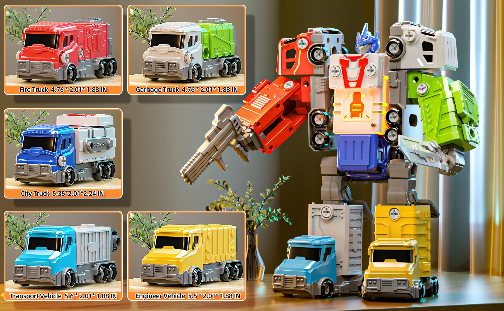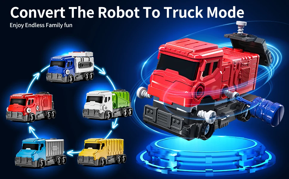 - 🚛 Multi-Form Transformation: Each truck – from the red fire engine to the green garbage hauler – plays a vital role in the robot’s structure. Combine them all to form a mega-bot or enjoy each as a standalone vehicle for interactive truck play.