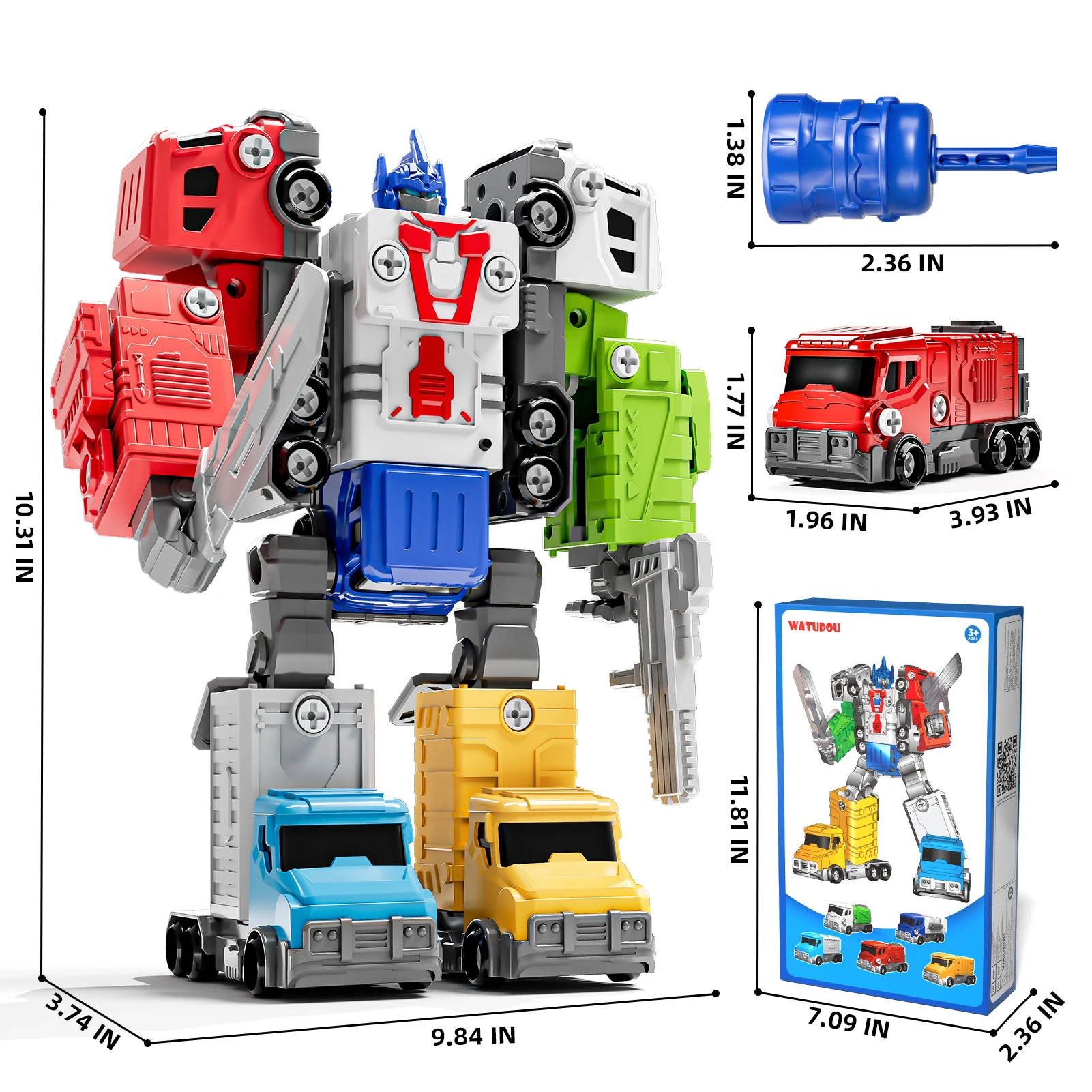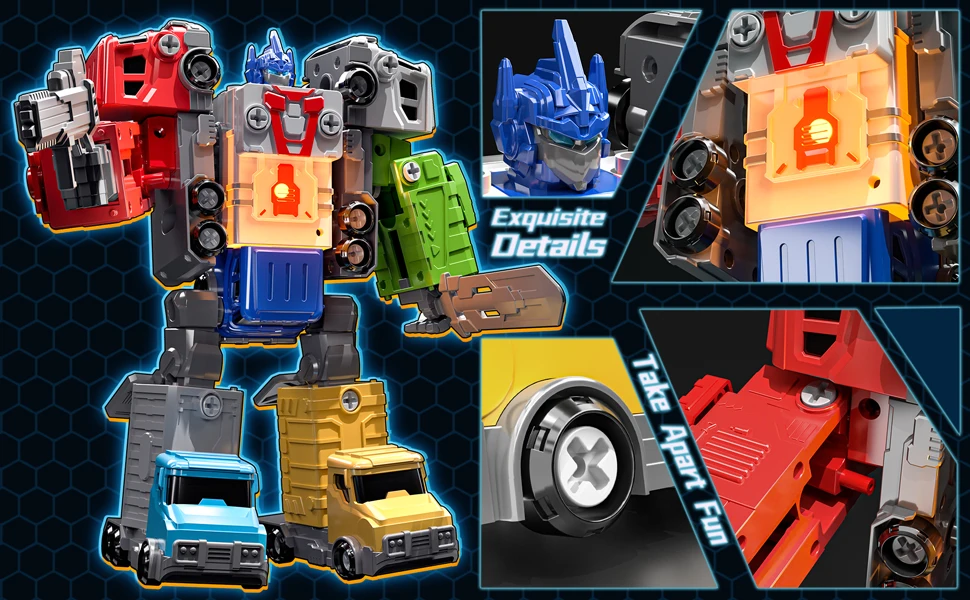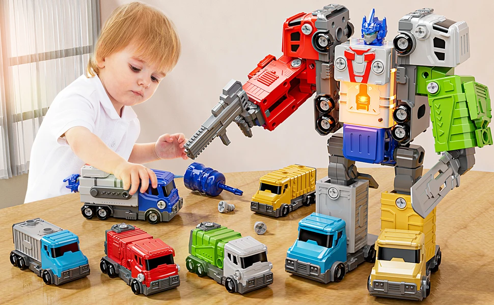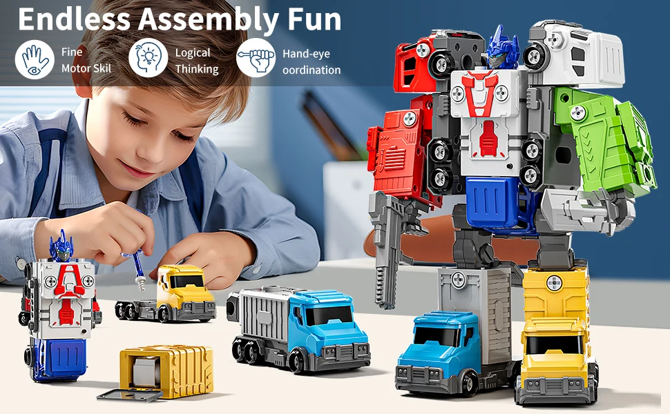 - ðŸ› ï¸ Endless Assembly Fun: Perfect for developing fine motor skills, logical thinking, and hand-eye coordination. Kids use the included screwdriver to assemble the vehicles into a towering 10.3-inch action robot or convert each segment back into trucks for hours of imaginative play.