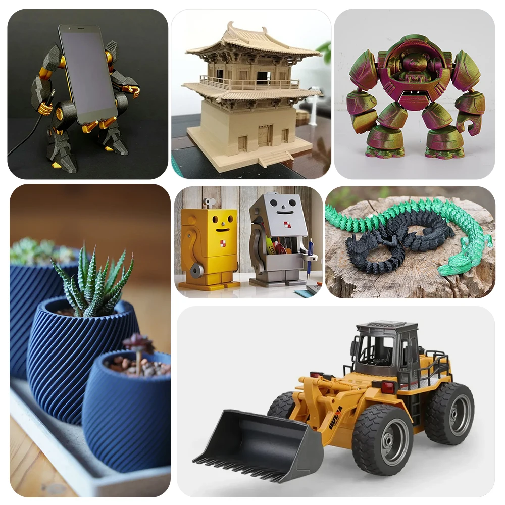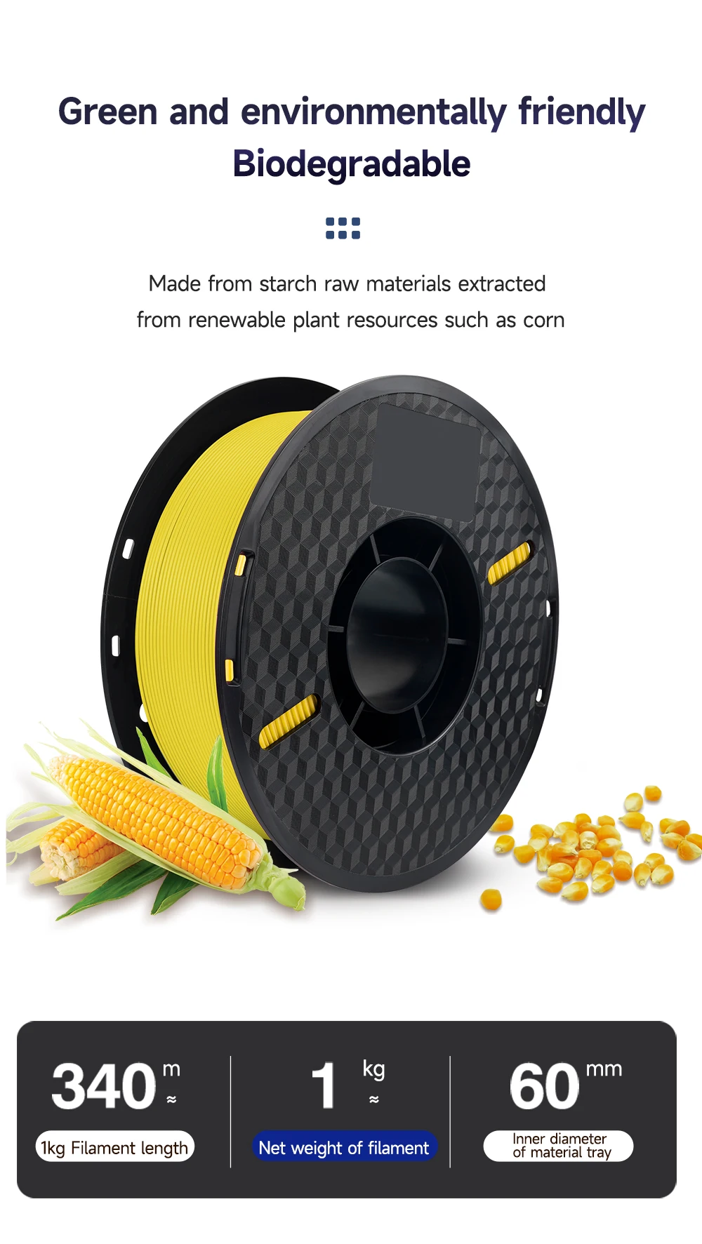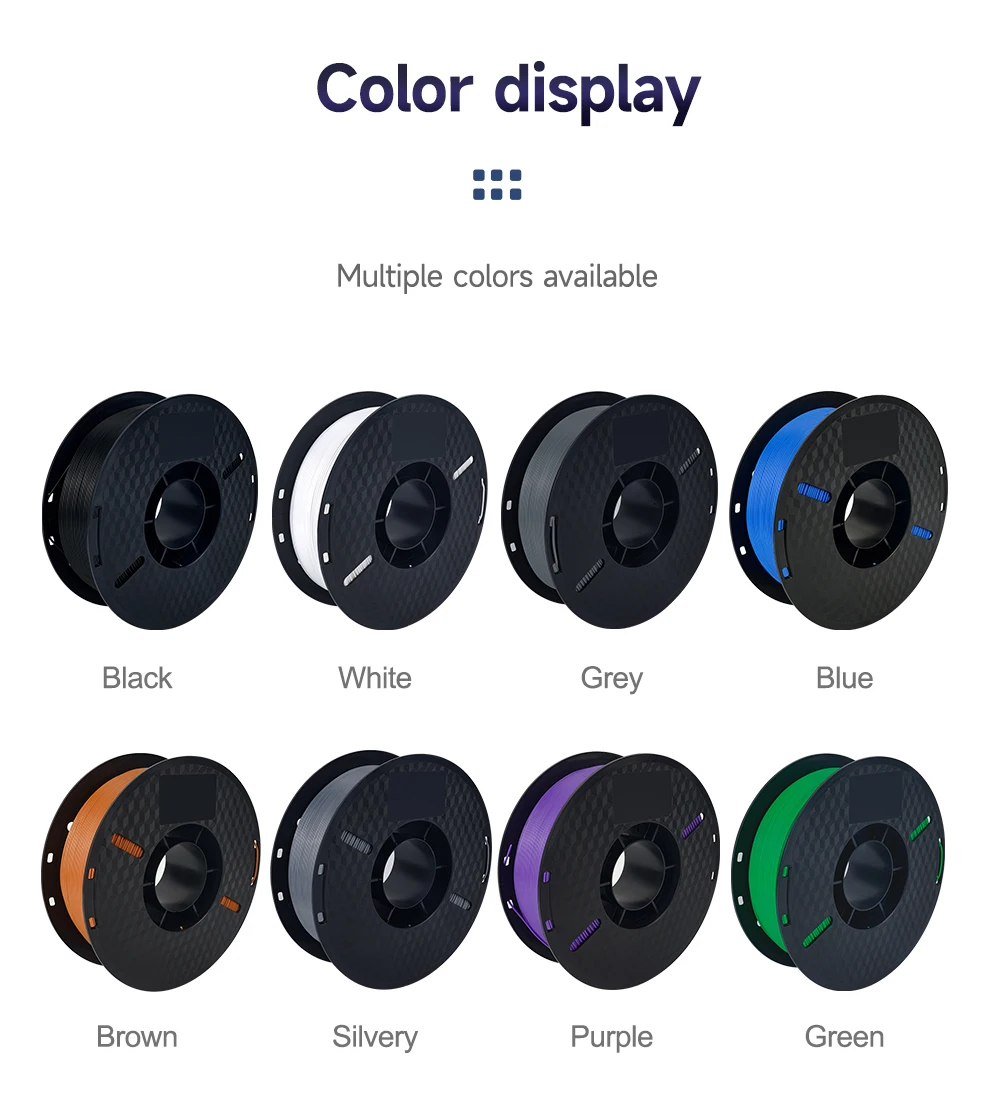 PLA, or Polylactic Acid, is a commonly used thermoplastic material that does not require the use of a heated print bed. Because of the lower melting temperatures and lack of warping, PLA filaments retain their color vibrancy and are a common choice for displays or small household prints. The 3D printed object will have a glossy finish. We love it because it offers: