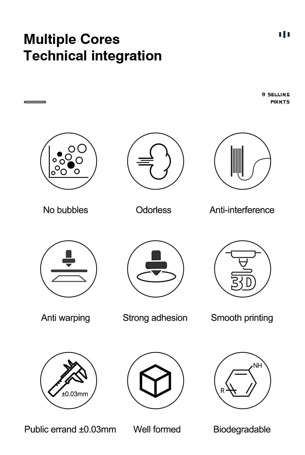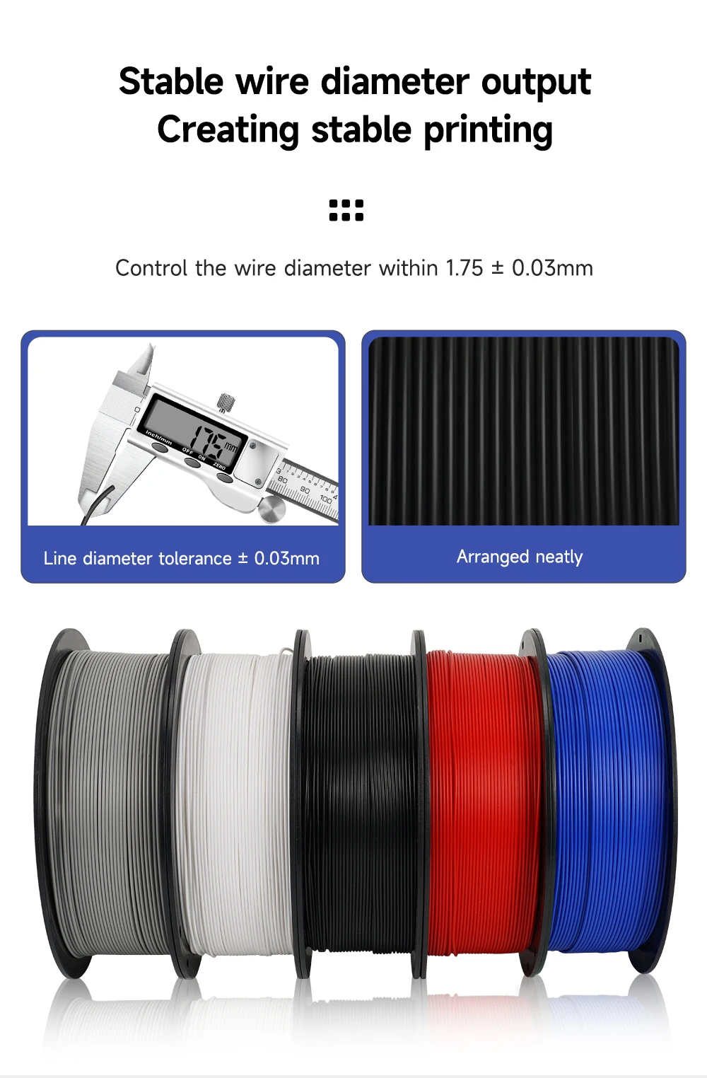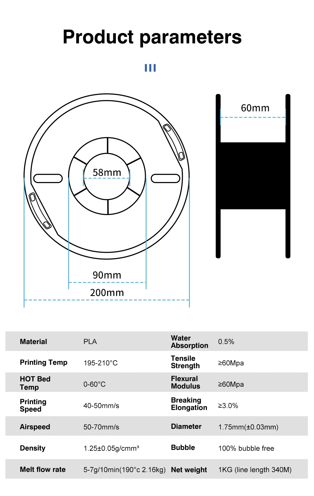 PLA, or Polylactic Acid, is a commonly used thermoplastic material that does not require the use of a heated print bed. Because of the lower melting temperatures and lack of warping, PLA filaments retain their color vibrancy and are a common choice for displays or small household prints. The 3D printed object will have a glossy finish. We love it because it offers: