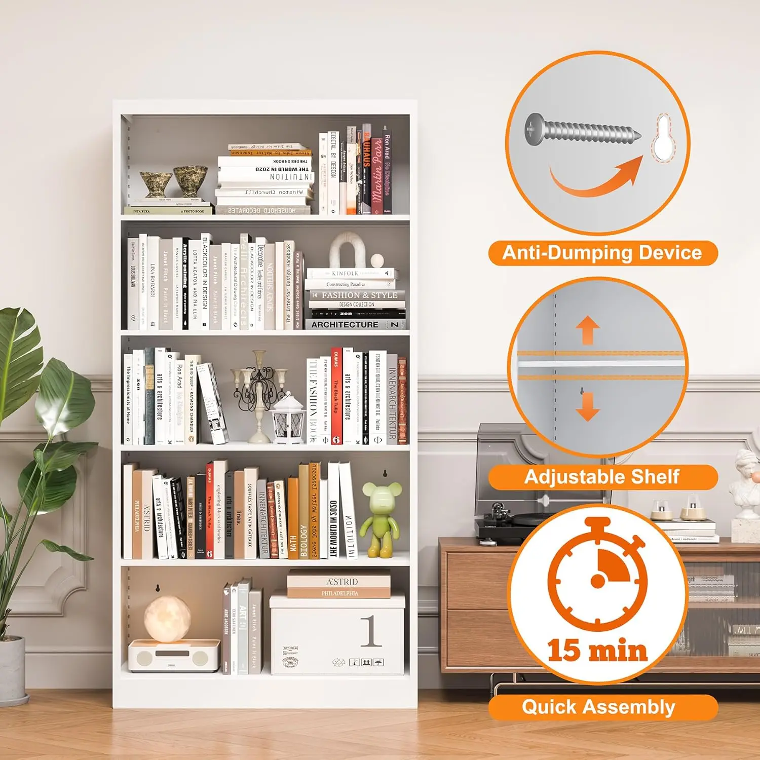 This 5 tier bookcase has four adjustable shelves. You can adjust the height according to your storage needs. As a white bookshelf, this is one of our very distinctive designs. You can also use this bookshelf as a 6-layer bookshelf, and the top can also hold your favorite books.