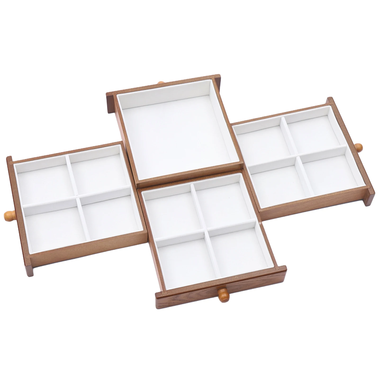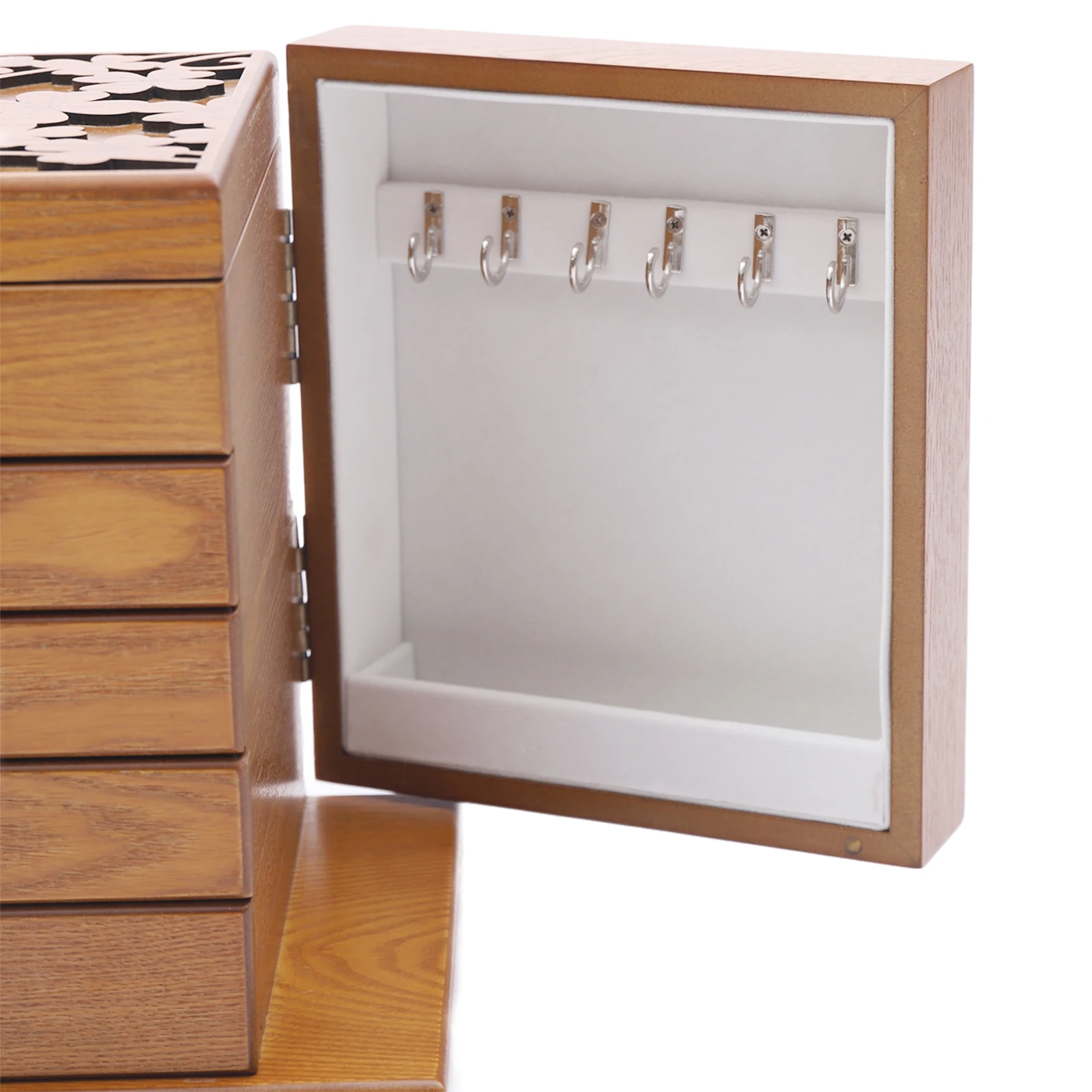 - Large capacity: Multiple compartments on the top layer for frequently used accessories (earrings, rings). Four drawers with divided sections hold necklaces and bracelets. Six hooks and pin slots on both sides store hairpins, brooches, and pearl necklaces.