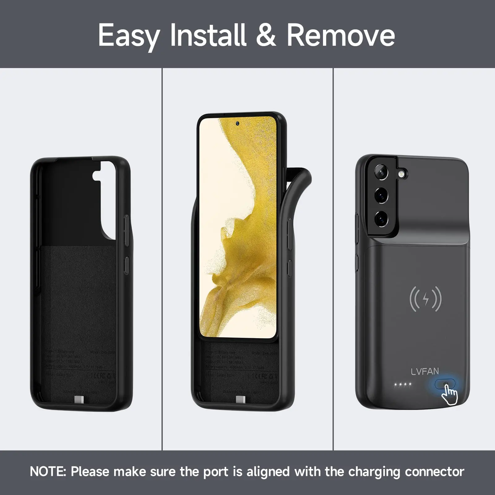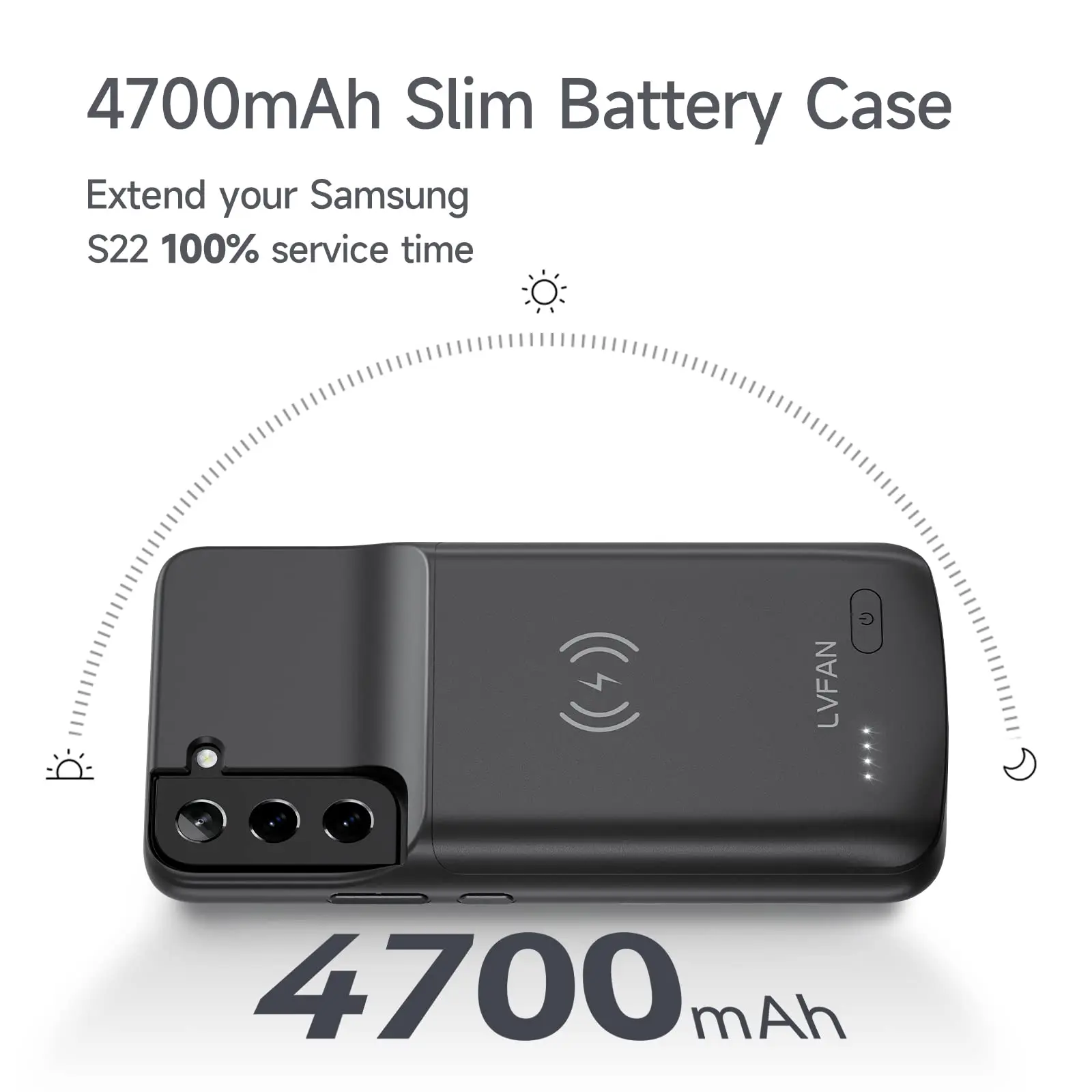 Keep your Samsung Galaxy S22 powered throughout the day with this slim 4700mAh battery charging case. Designed only for the Galaxy S22, this case helps extend battery life while also giving your phone added everyday scratch protection. It supports Qi wireless charging, Bluetooth headphones, data sync, Samsung Pay, Samsung Dex, and QC3.0 18W quick charge adapters for added convenience.