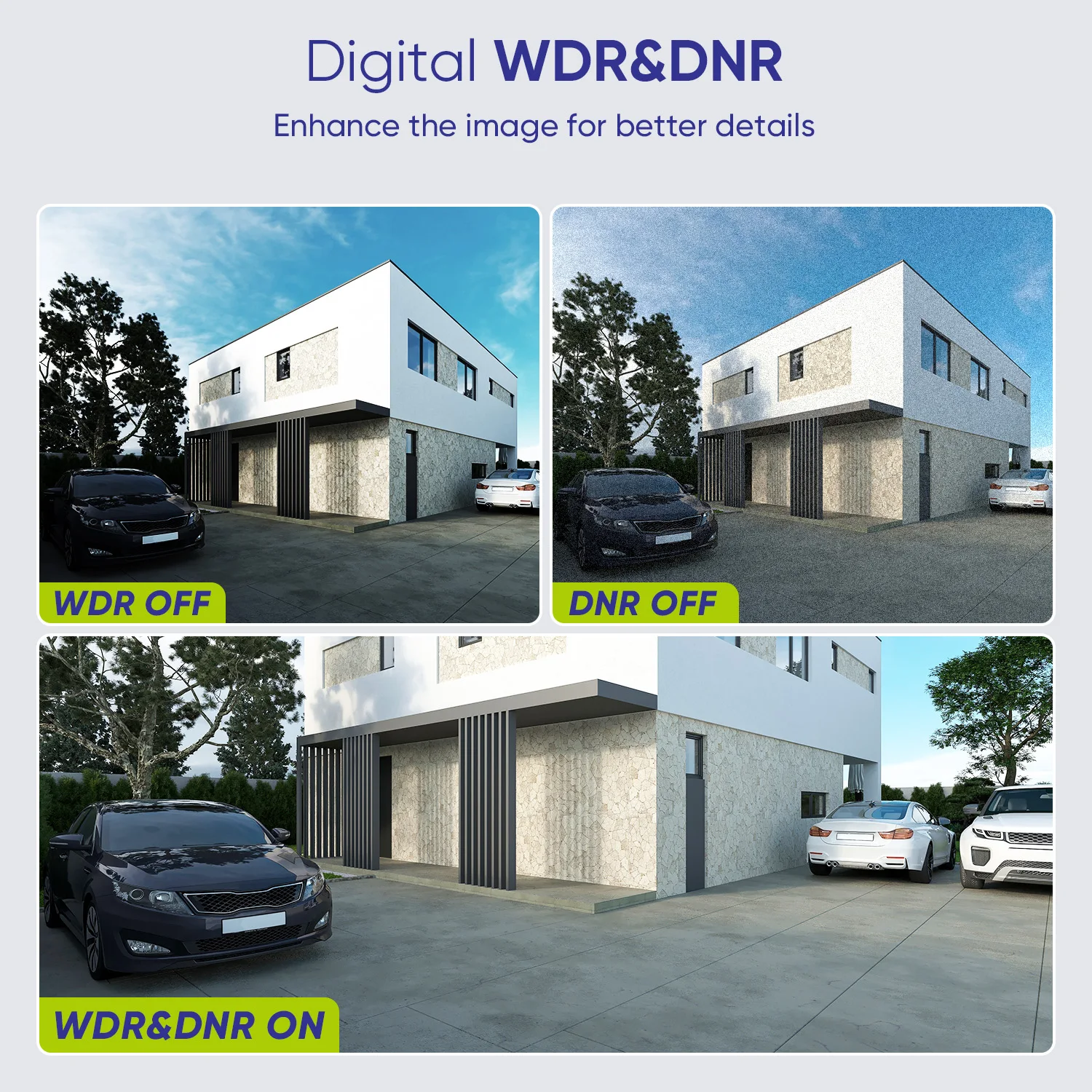 Digital WDR ensures sharp images even in the strongest lighting conditions, no overexposed/underexposed issues. DNR removes image noise in darkness to provide cleaner & clearer pictures.