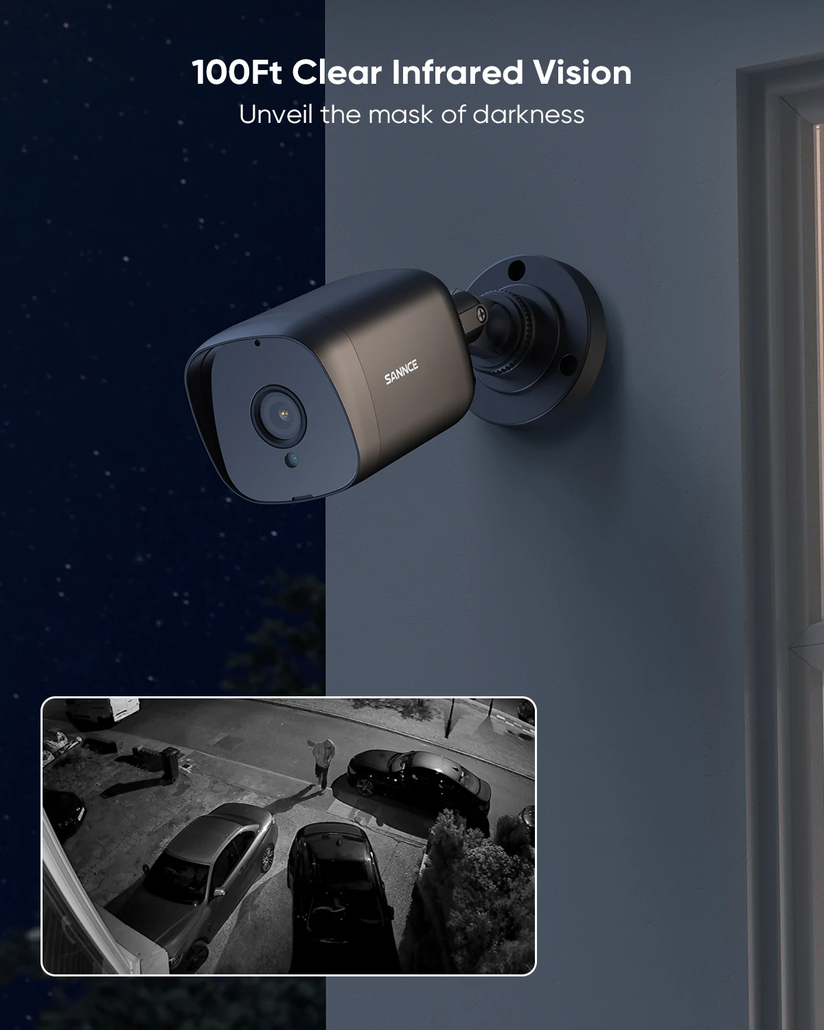 12 built-in IR LEDs with the IR-cut filter turn on automatically to provide enough lighting, in order to capture crystal videos (up to 100 ft) in 0 lux illumination night.