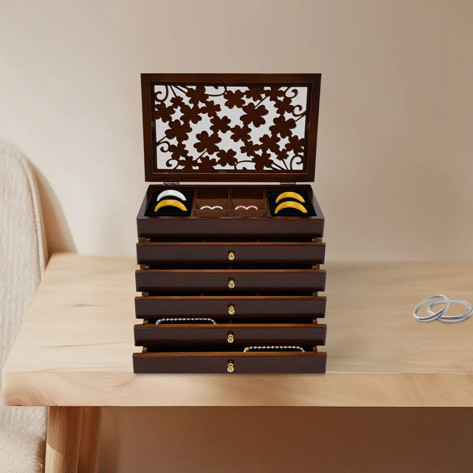 - Thoughtful design: A metal handle makes drawers easy to open and close, and the top cover protects jewelry from dust and damage.
